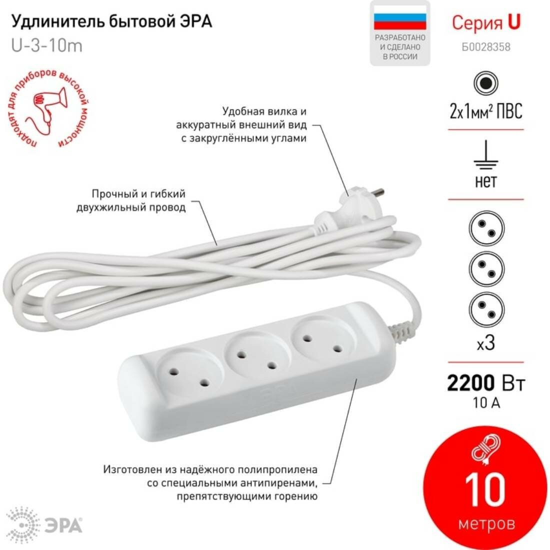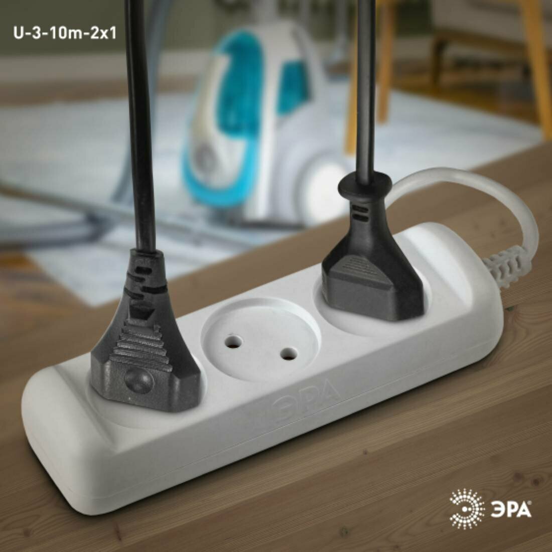 Купить Удлинитель электрический ЭРА без заземления 3 розетки ПВС 2x1мм2 10А 10м белый Б0028358