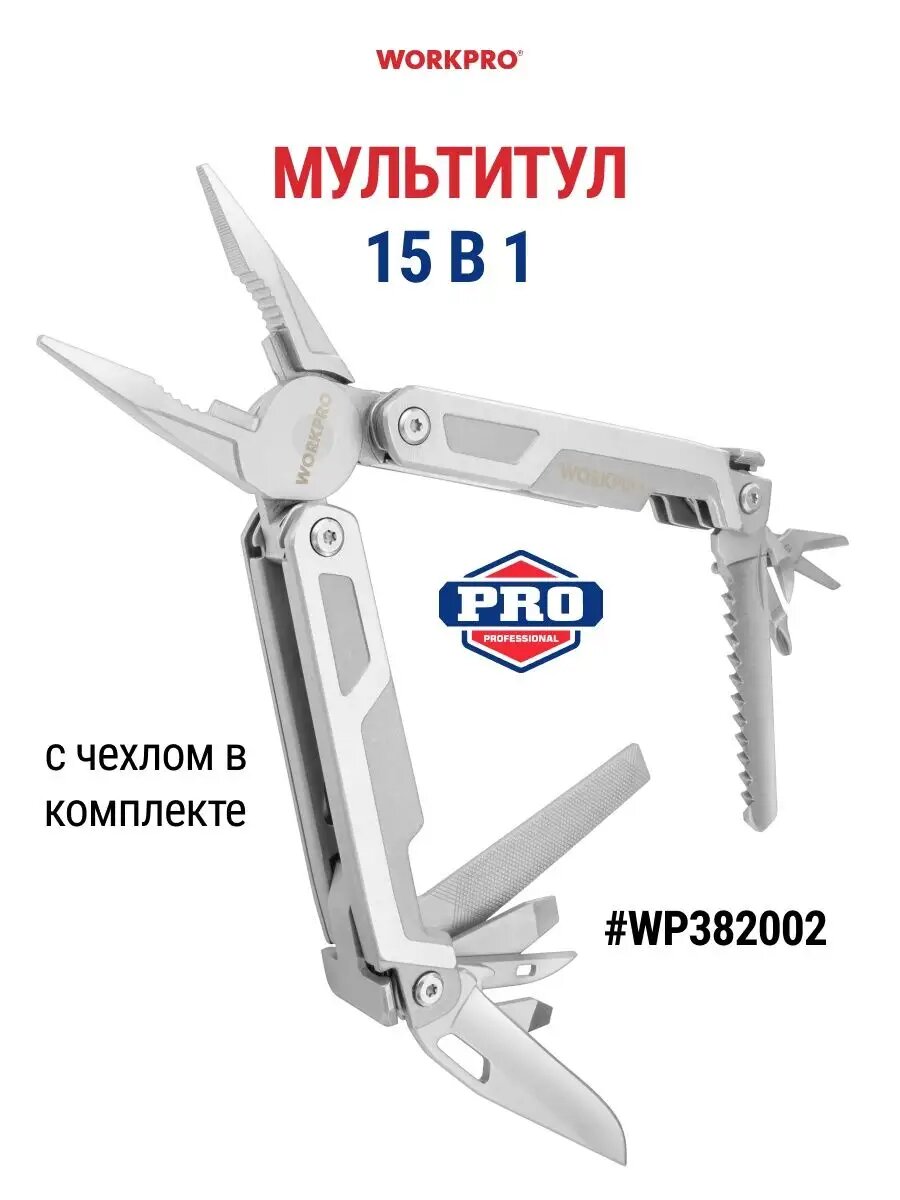 Купить Мультитул универсальный 15 в 1, WP382002, WORKPRO, цвет серебристый