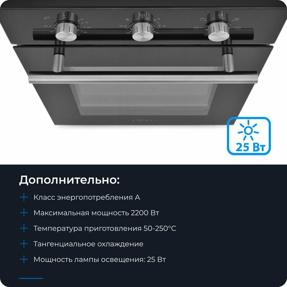 Духовой шкаф электрический встраиваемый ZUGEL ZOE451B, 2200 Вт, 50 л, утапливаемые регуляторы, таймер, класс энергопотребления А, эмаль, 6 режимов работы, конвекция + гриль, черный