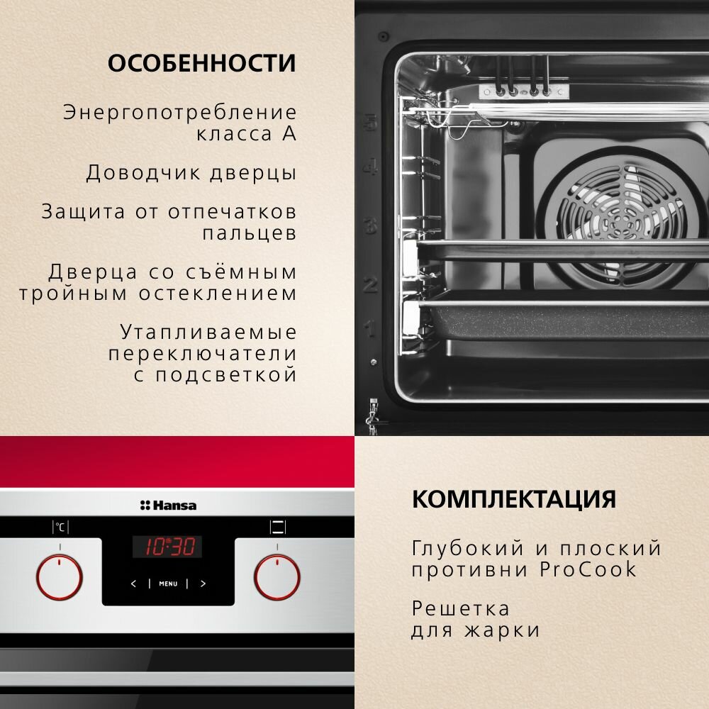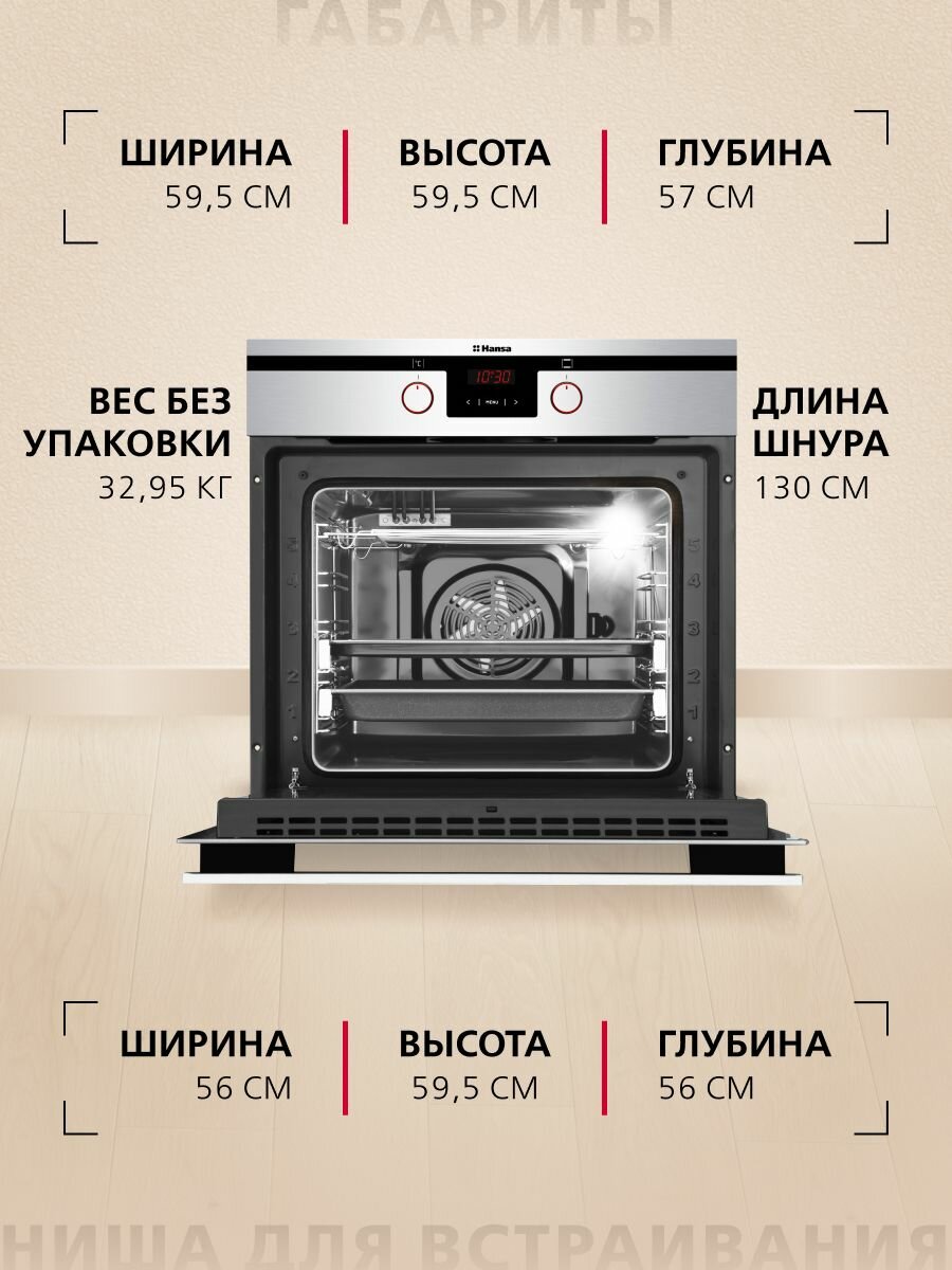 Купить Электрический духовой шкаф Hansa BOEI69475 встраиваемый 60 см, 65 л, 10 режимов, с дисплеем, таймером, функцией 3D нагрева, конвекцией, грилем и телескопическими направляющими