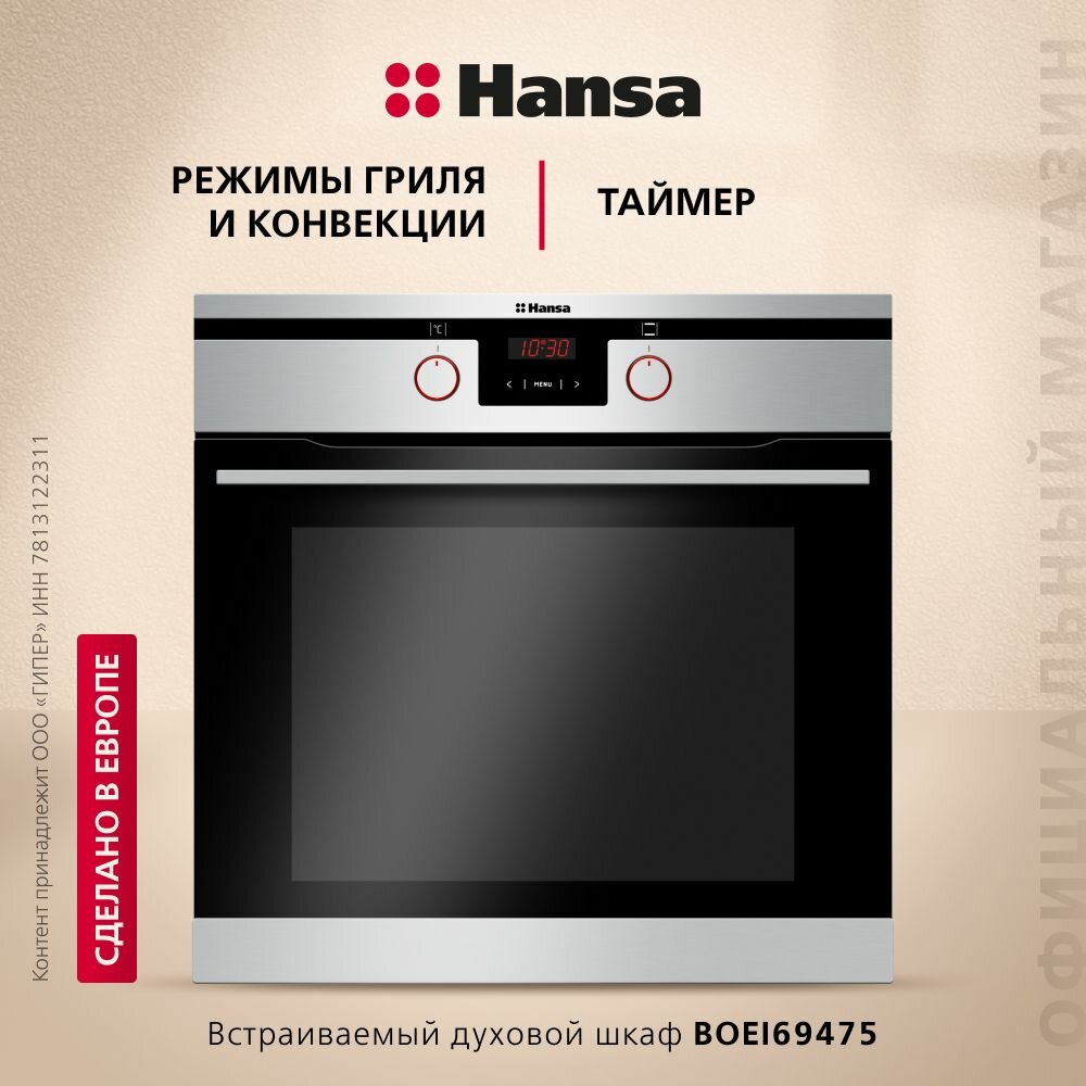 Электрический духовой шкаф Hansa BOEI69475, встраиваемый, 60 см, 65 л, 10 режимов, с дисплеем, таймером, конвекцией, грилем, телескопическими направляющими, цвета нержавеющей стали