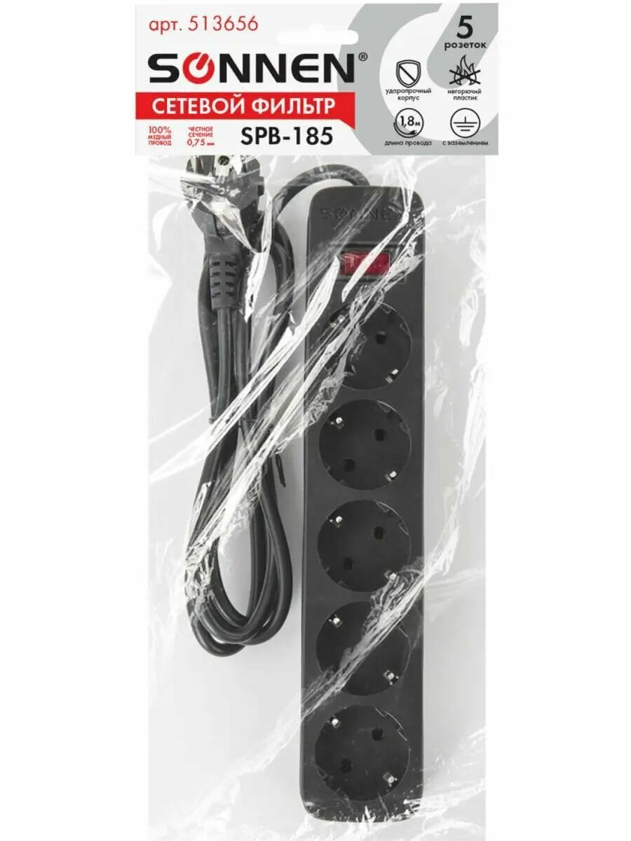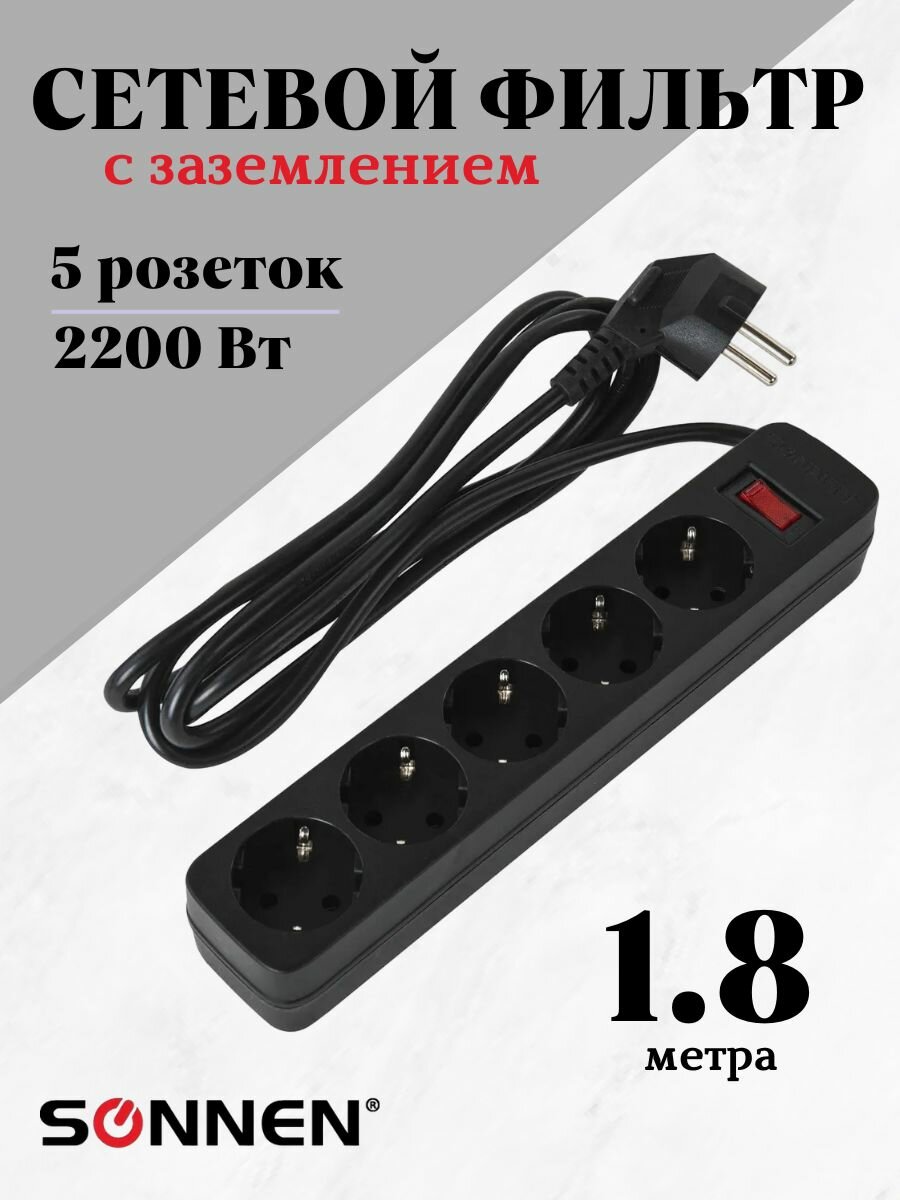Купить Удлинитель сетевой фильтр SONNEN, с предохранителем, с заземлением, 2200 Вт, 5 розеток, 3х1,0 мм, выключатель на корпусе