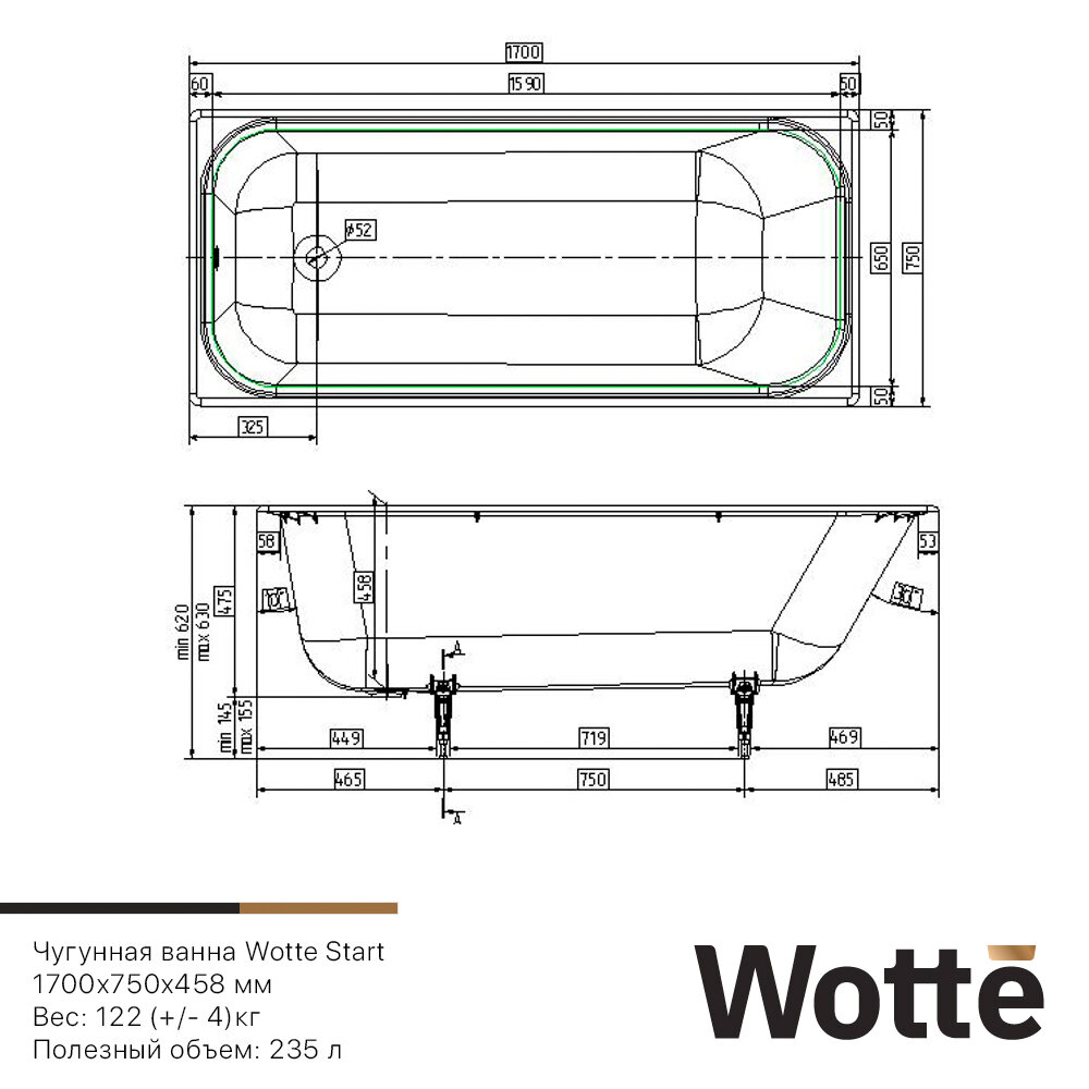 Чугунная ванна 170x75 см Wotte Start 1700x750UR
