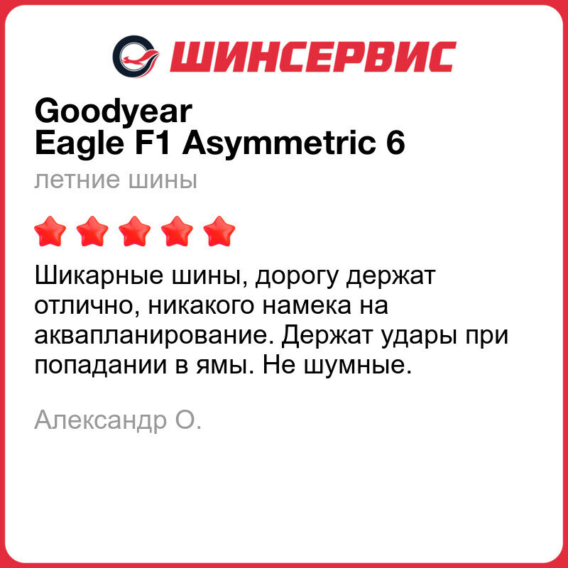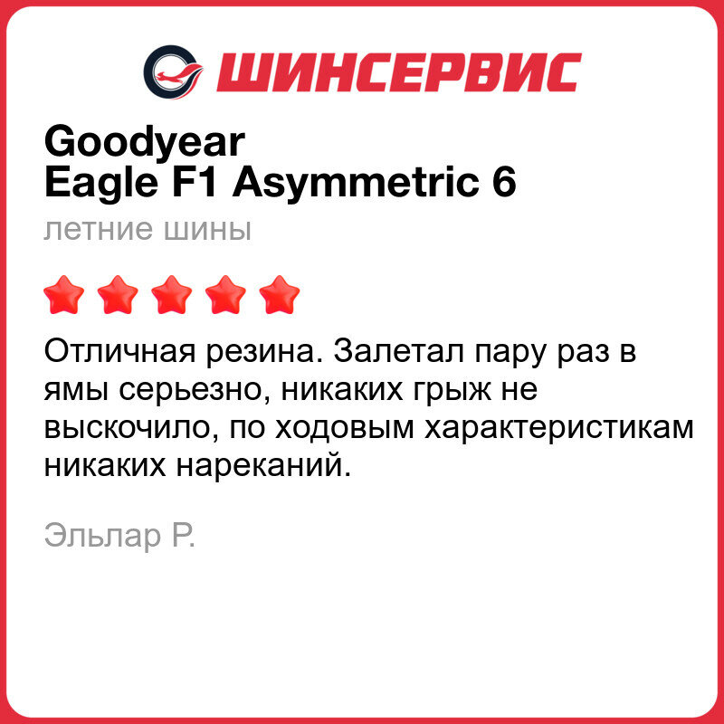 | Отзыв: | Взял Goodyear F1 Asymmetric 6, после того, как откатал 5 сезонов на предыдущей модели. В городе и на трассе шины показали себя с лучшей стороны: эффективно тормозят на мокрой дороге, курсовую устойчивость машина не теряет. Посмотрю как будут изнашиваться, надеюсь, прослужат не меньше своих предшественников. В общем, резина роскошная, стоит своих денег. |