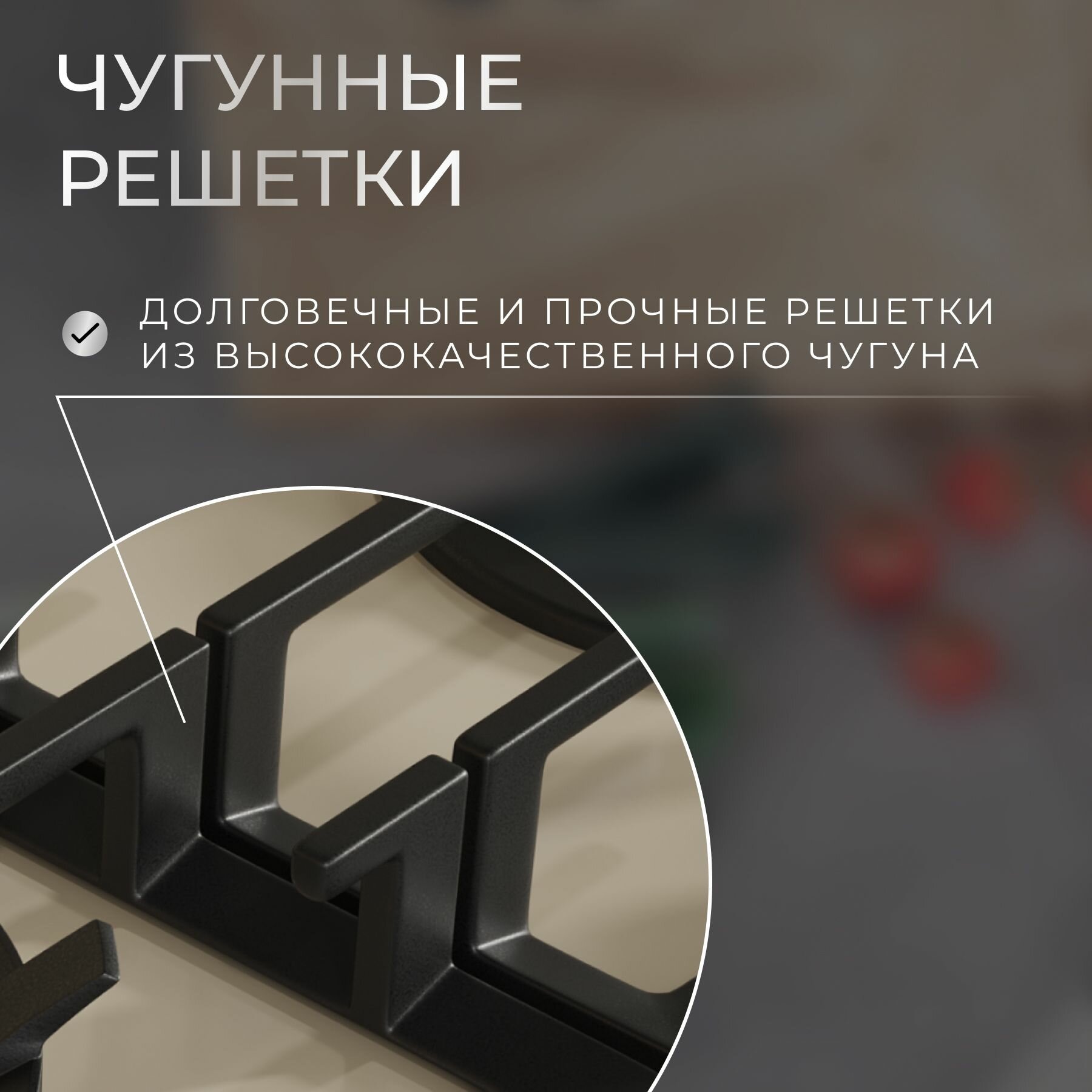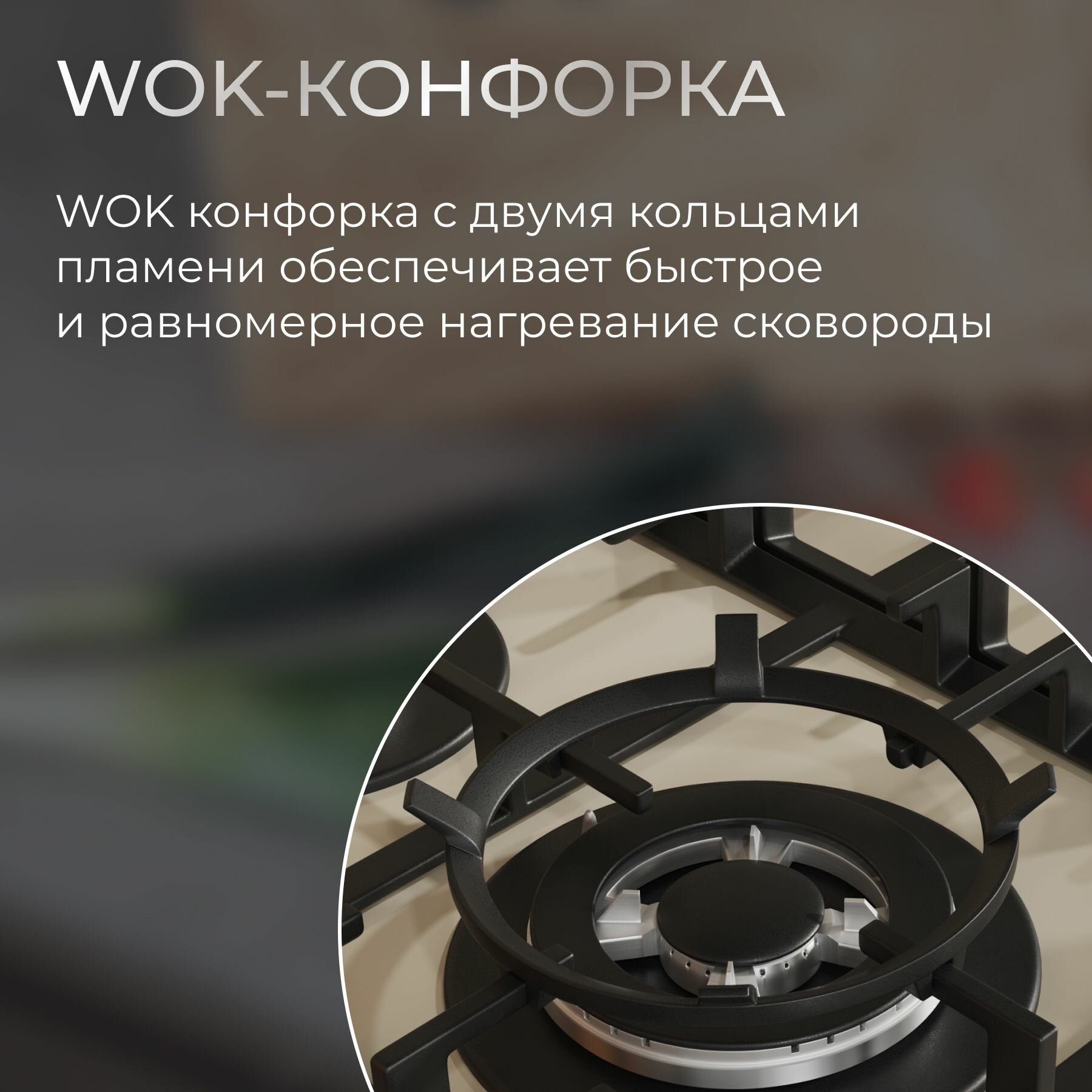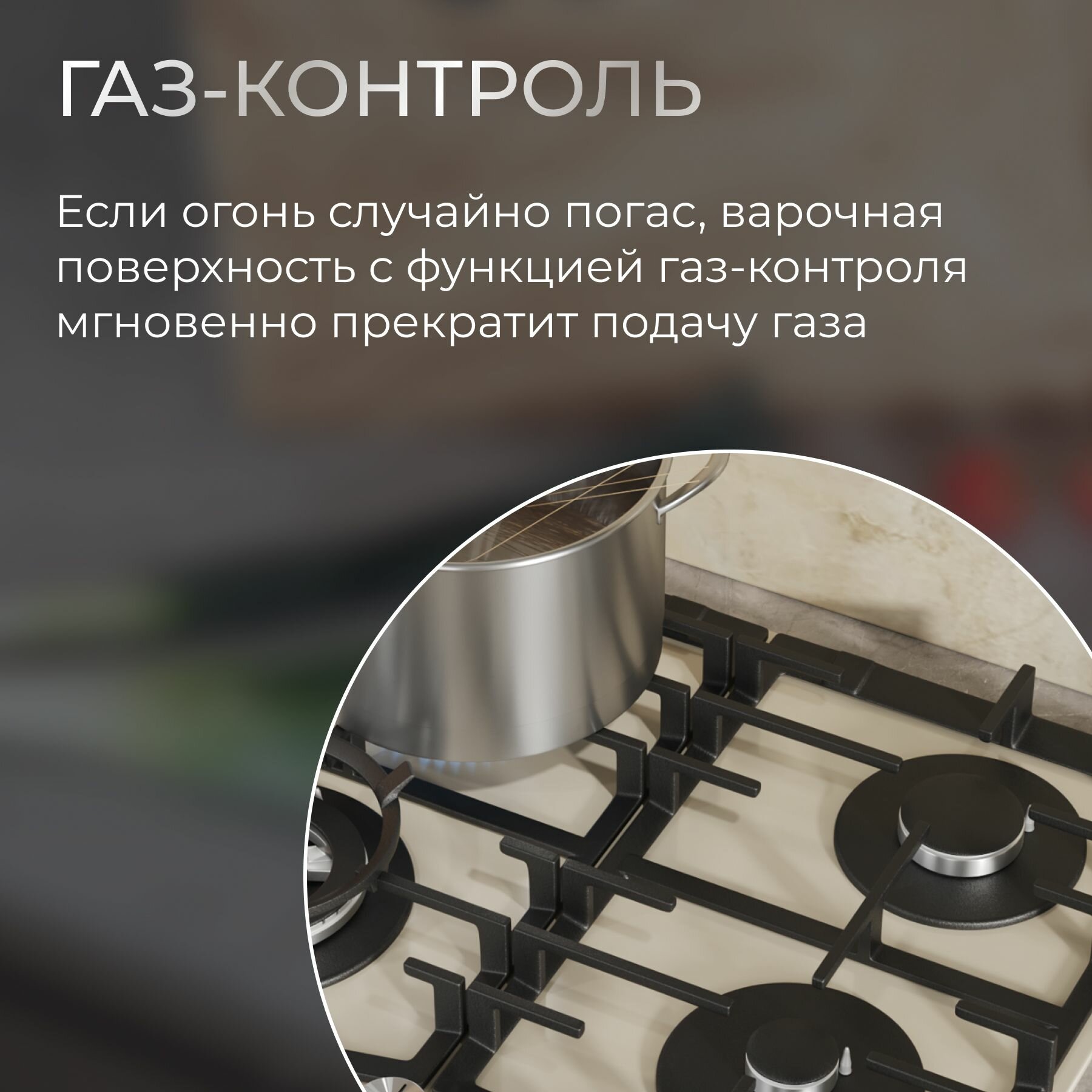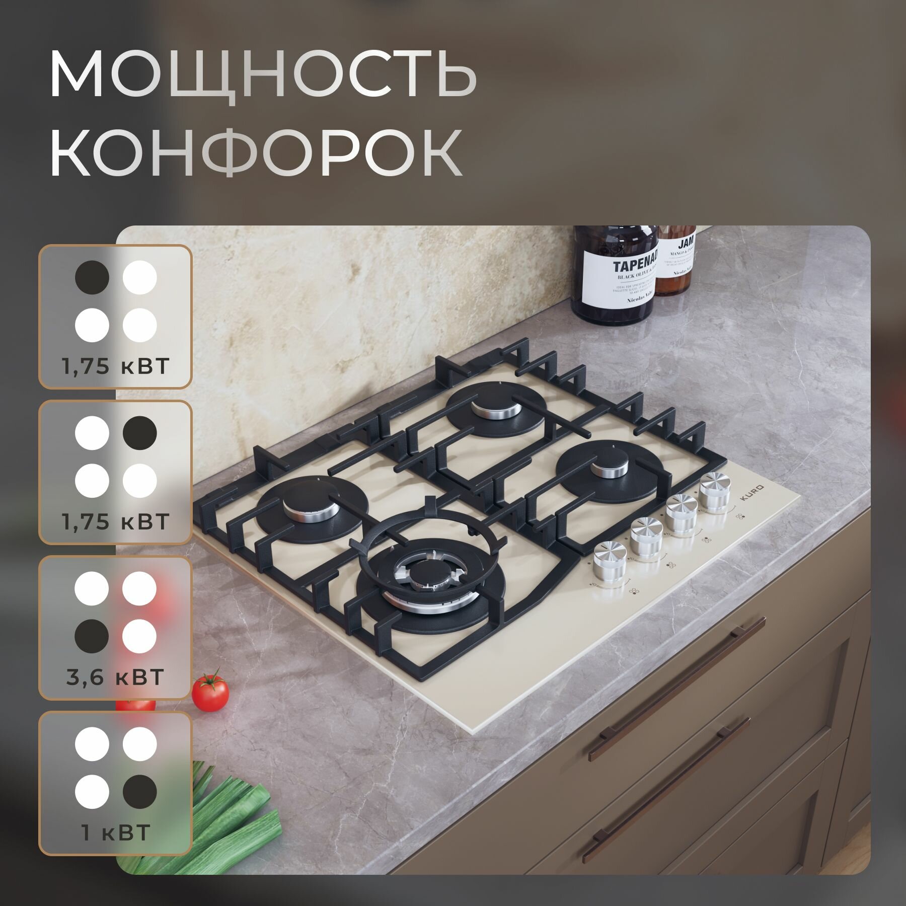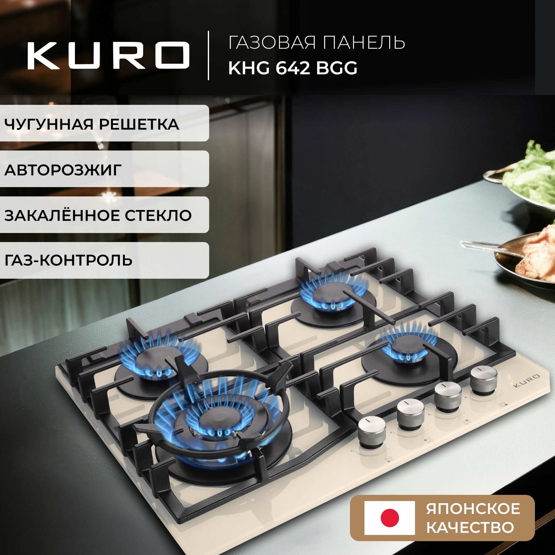 Газовая встраиваемая варочная панель 60 см KURO KHG 642 BGG, газ-контроль, электроподжиг, WOK-конфорка, чугунные решетки, бежевая интересное: