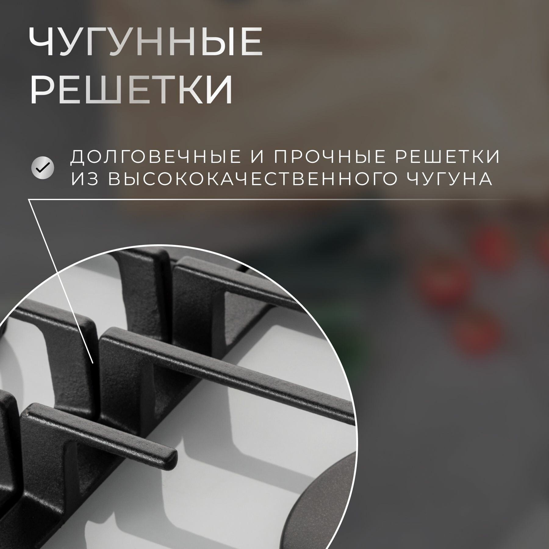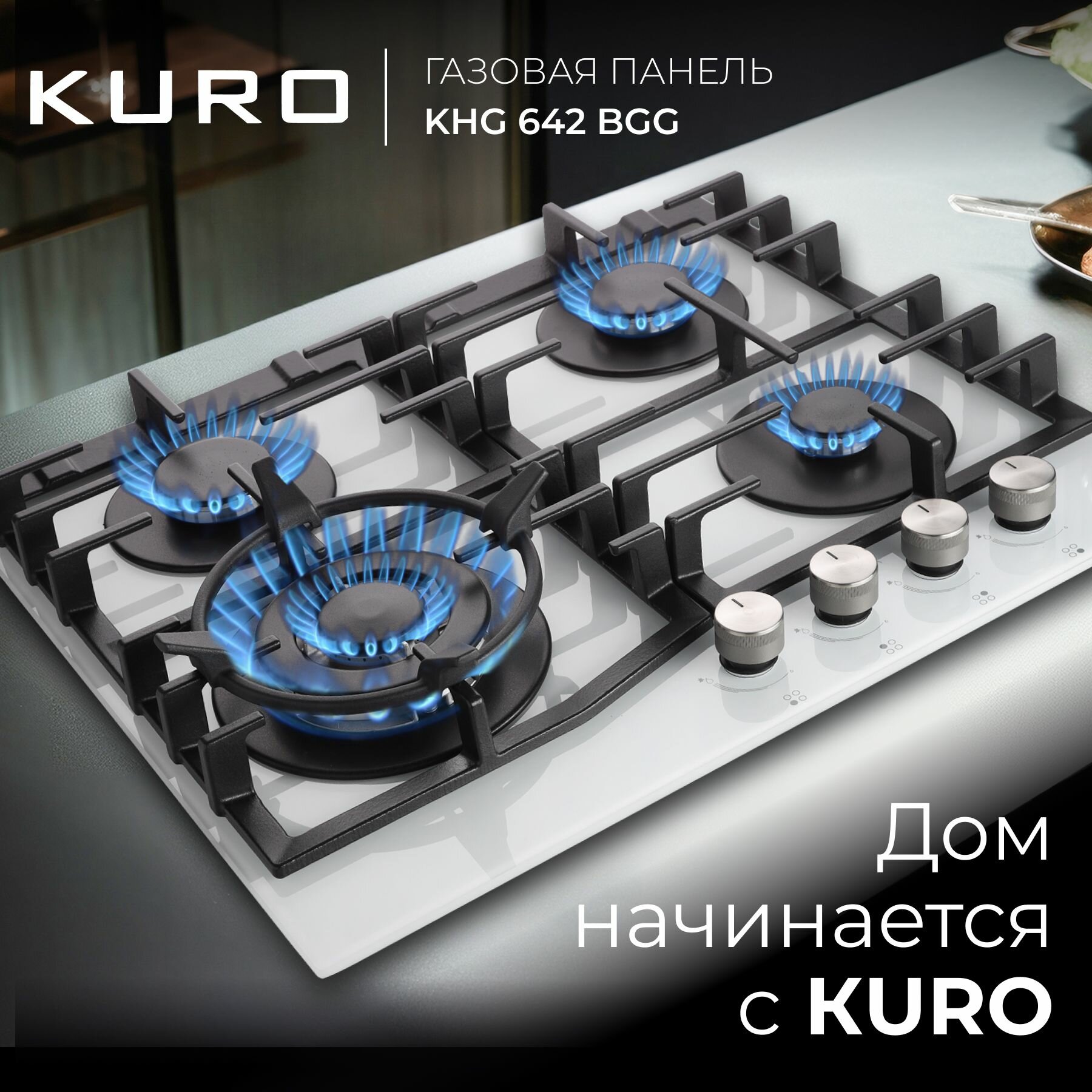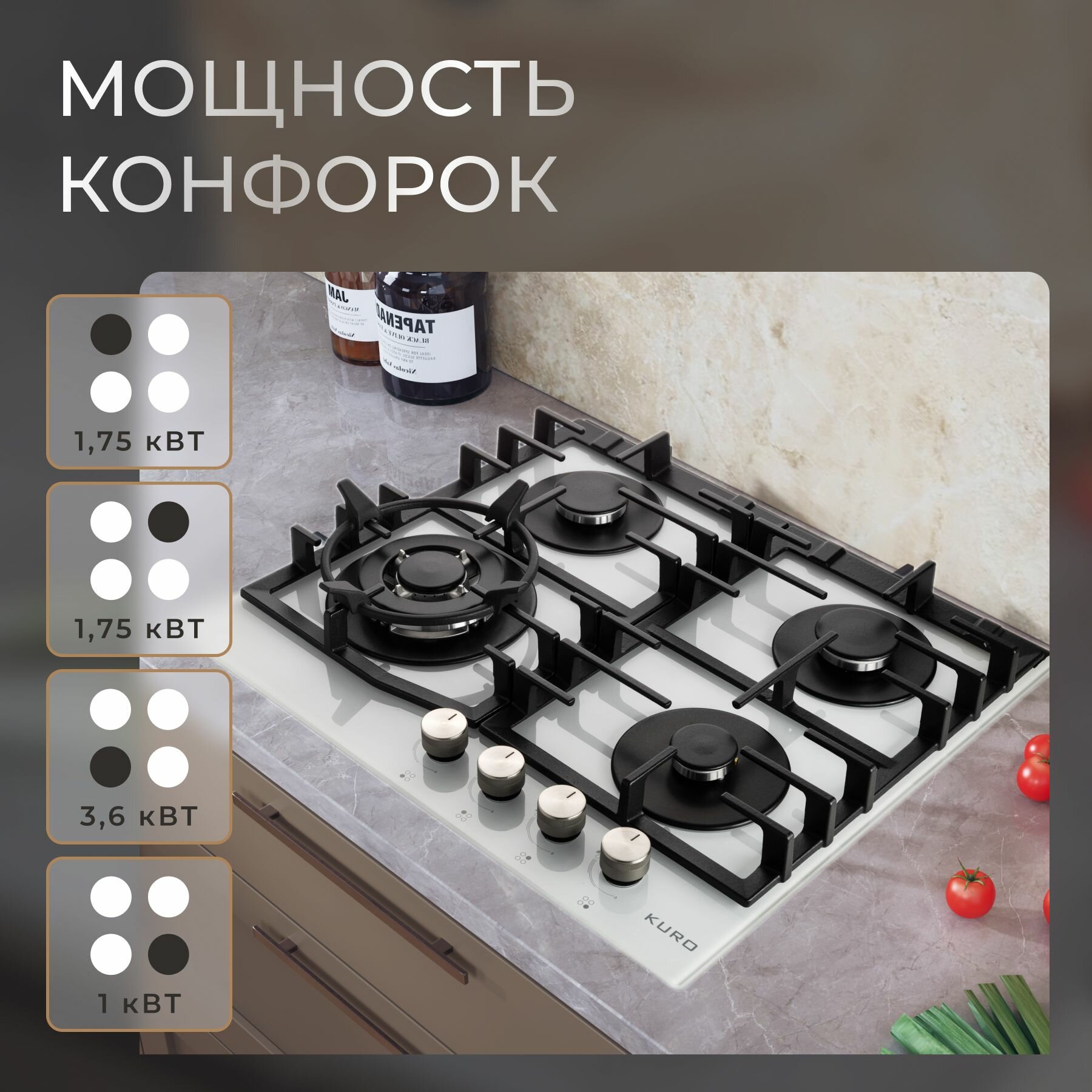 Газовая встраиваемая варочная панель 60 см KURO KHG 642 WG, газ-контроль, электроподжиг, WOK-конфорка, чугунные решетки, белая интересное: