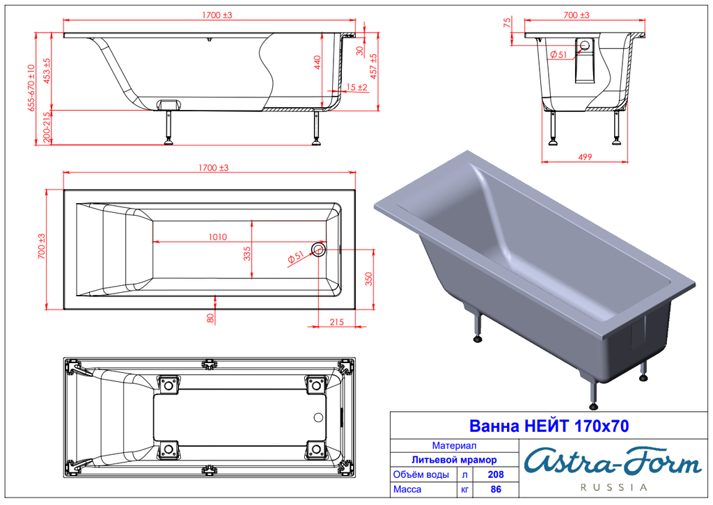 Ванна из литьевого мрамора Astra-Form Нейт 170x70 с ножками в комплекте