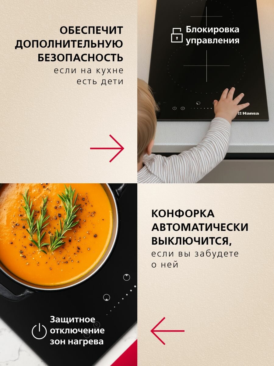 Купить Индукционная варочная панель Hansa BHI36277, двухконфорочная, стеклокерамическая поверхность, блокировка от детей, таймер, автоотключение, индикация остаточного тепла, черная