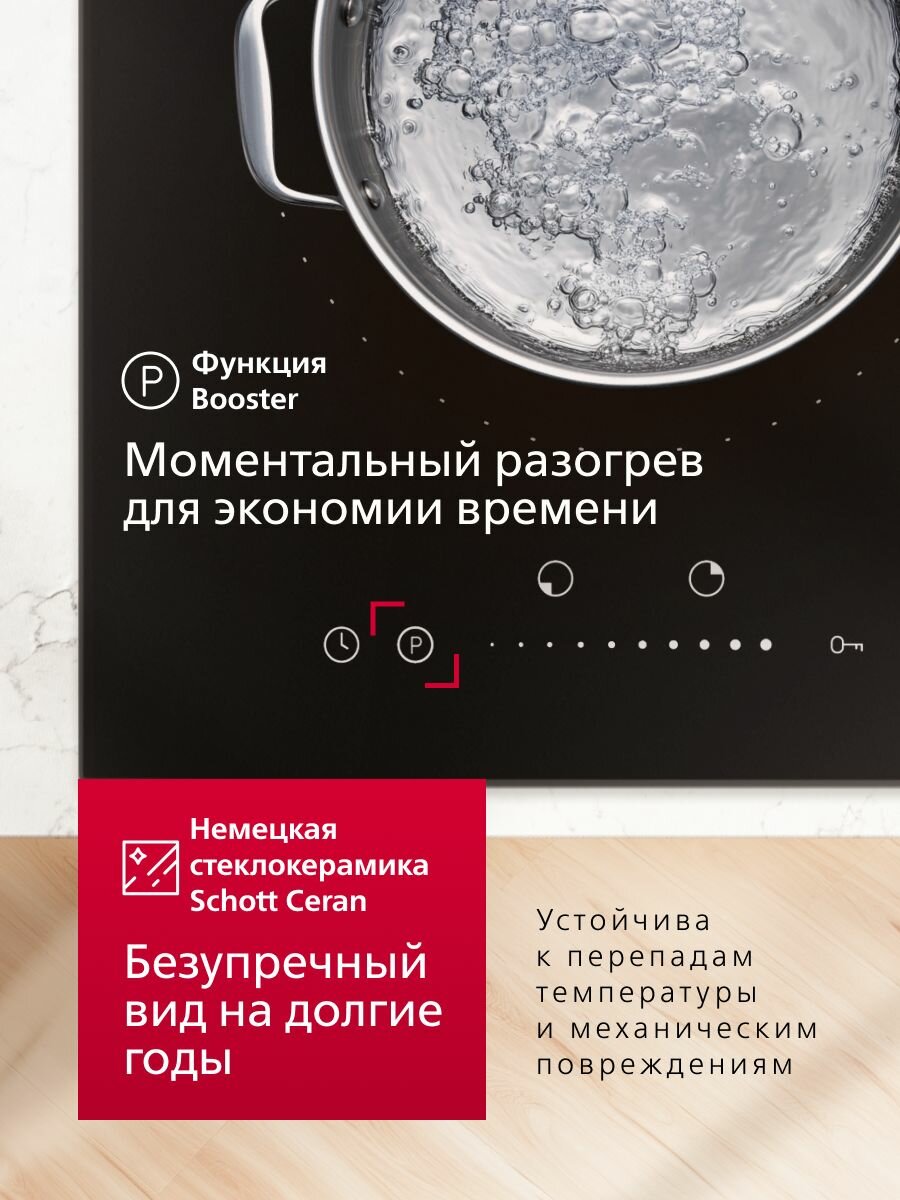 | Отзыв: | При выборе индукционной панели для меня было самое главное керамическая поверхность стойкая к царапинам. И второе есть функция бустер при которой вода вскипает намного быстрее. Остальные функции как у всех. |