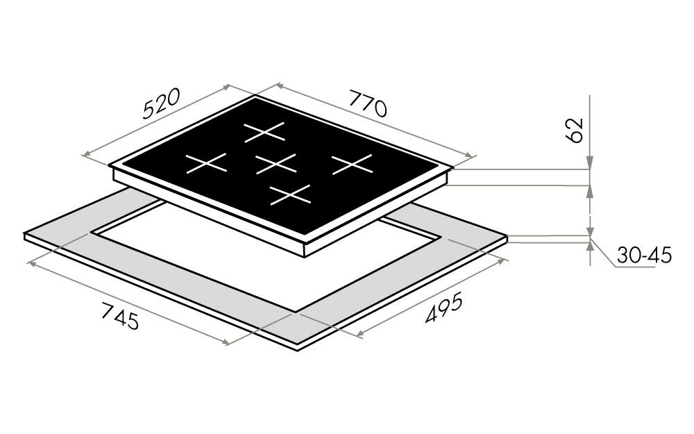| Размеры конфорок | средняя конфорка 20 см, левая конфорка 40х20 см, правая конфорка 40х20 см, совместимость с посудой любого размера |