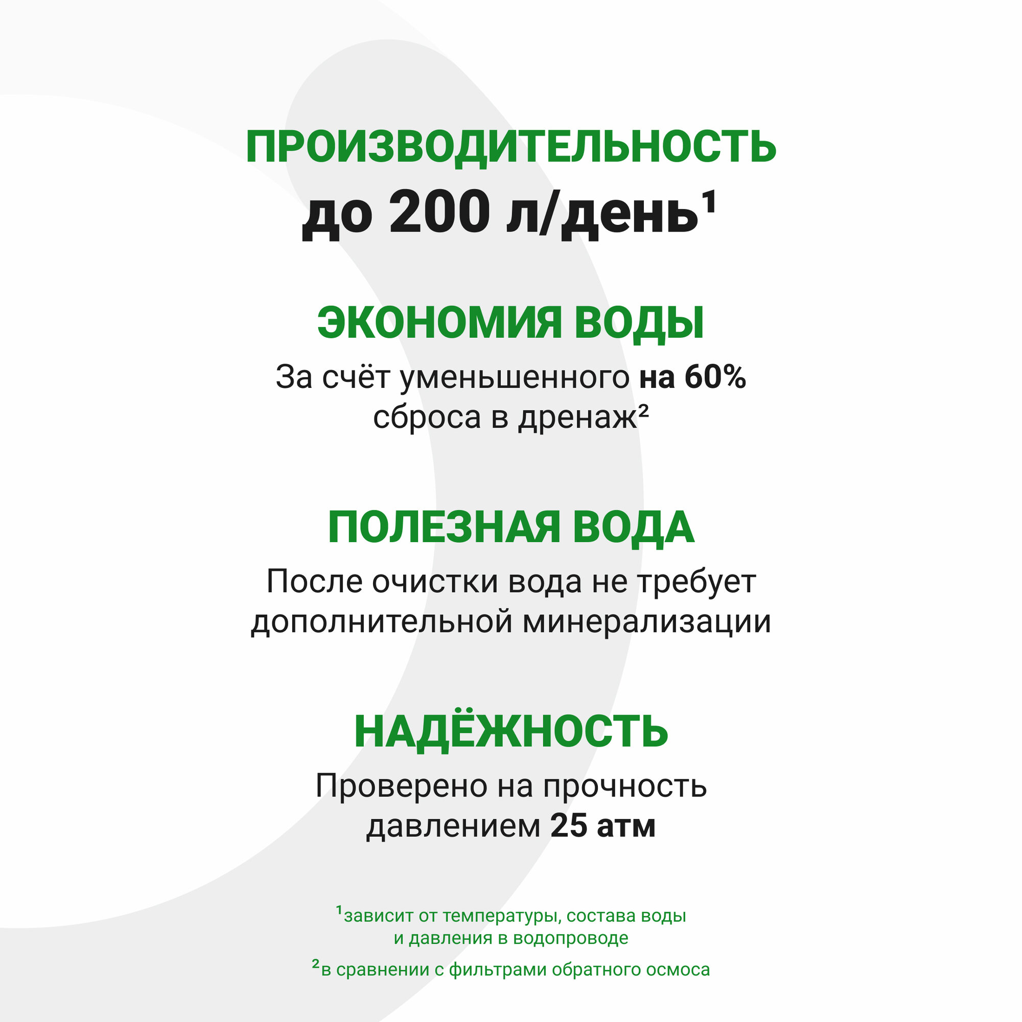 Очистка механическая а не химическая как в ионообменных засыпках проточных фильтров. Обьем дренажной воды намного меньше чем у стандартного осмоса. |