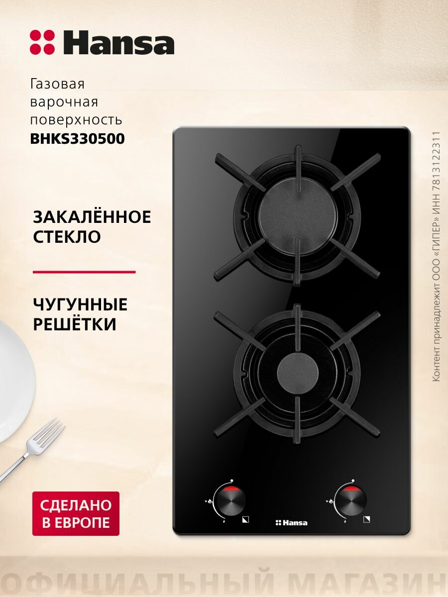 СохранитьГазовая варочная поверхность Hansa BHKS330500, двухконфорочная, стеклянная поверхность, с газ-контролем и автоподжигом, черная интересное: