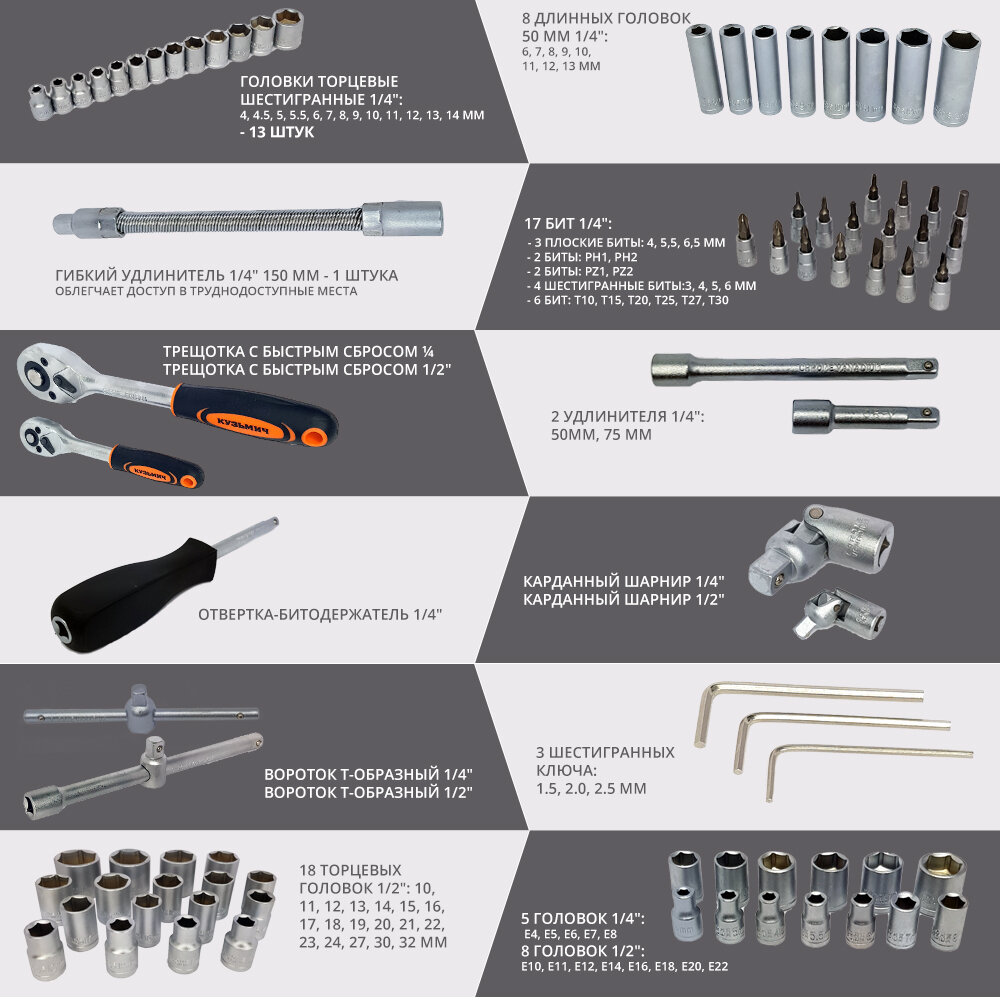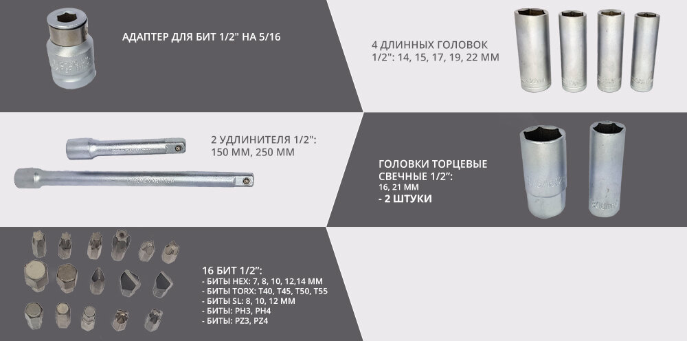 | Головки торцевые подробно | 1/4": 4, 4.5, 5, 5.5, 6, 7, 8, 9, 10, 11, 12, 13, 14 мм; длинные: 6, 7, 8, 9, 10, 11, 12, 13 мм; с битами: H3, H4, H5, H6, T10, T15, T20, T25, T27, T30, PH1, PH2, PZ1, PZ2, SL4, SL5.5, SL6.5; 1/2": 10, 11, 12, 13, 14, 15, 16, 17, 18, 19, 20, 21, 22, 23, 24, 27, 30, 32 мм; свечные: 16, 21 мм; длинные: 14. 15, 17, 19 мм |