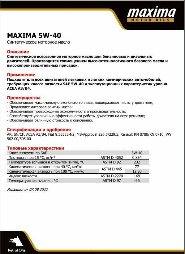 масло моторное petrol ofisi maxima 5w-40 синтетическое 4 л 11172-61yg
