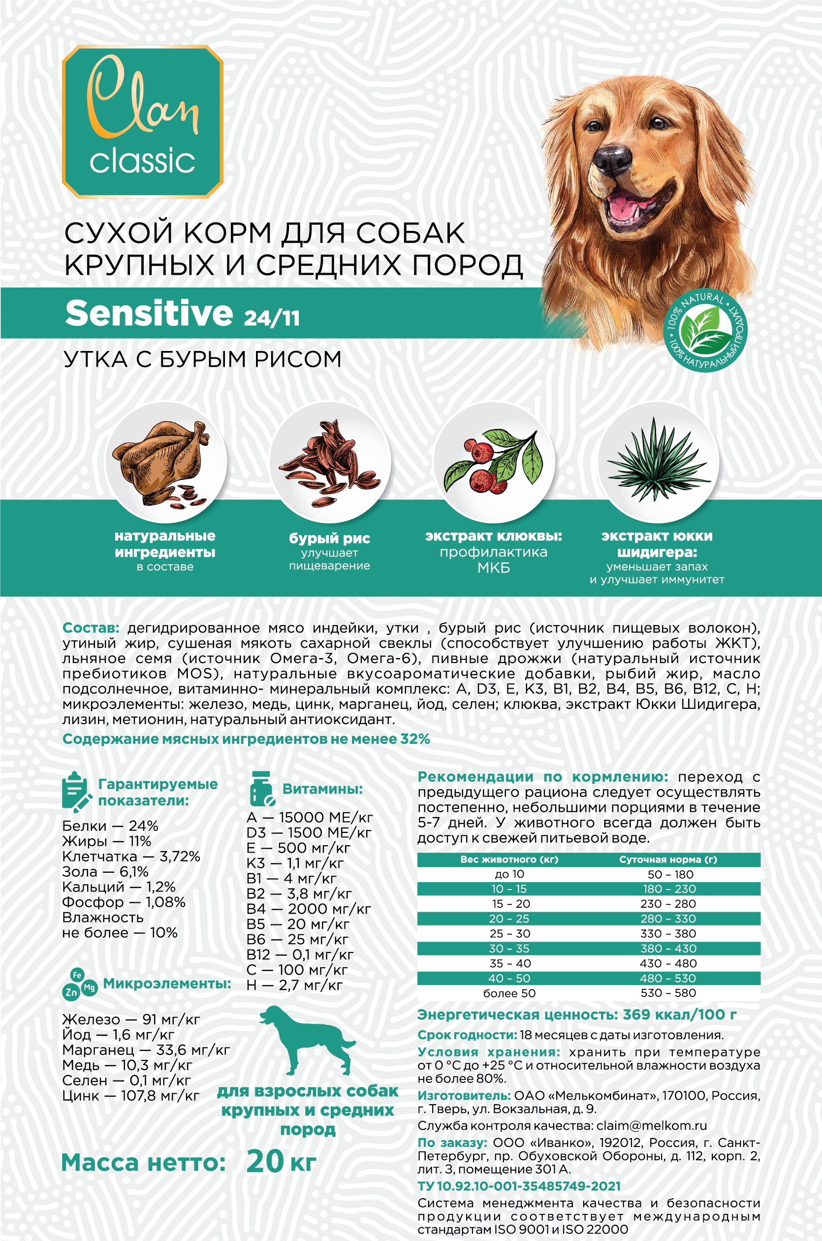 CLAN CLASSIC Sensitive-24/11 корм сухой для собак крупных и средних пород Утка с бурым рисом 3кг