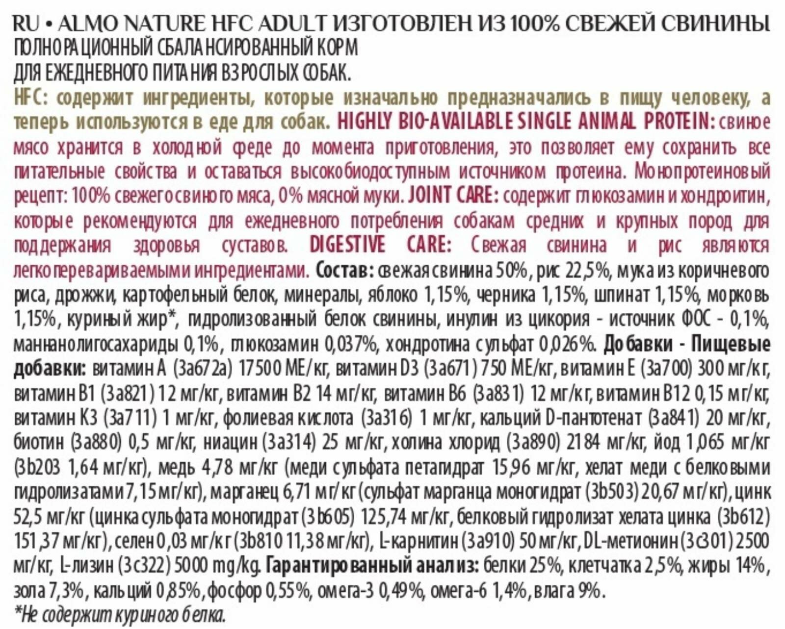 | Состав | свежая свинина 50%, рис 22,5%, мука из коричневого риса, дрожжи, картофельный белок, минеральные вещества, яблоко 1,15%, черника 1,15%, шпинат 1,15%, морковь 1,15%, куриный жир, гидролизованный свиной белок, инулин из цикория - источник ФОС- 0,1%, маннанолигосахариды 0,1%, глюкозамин 0,037%, хондроитинсульфат 0,026% |