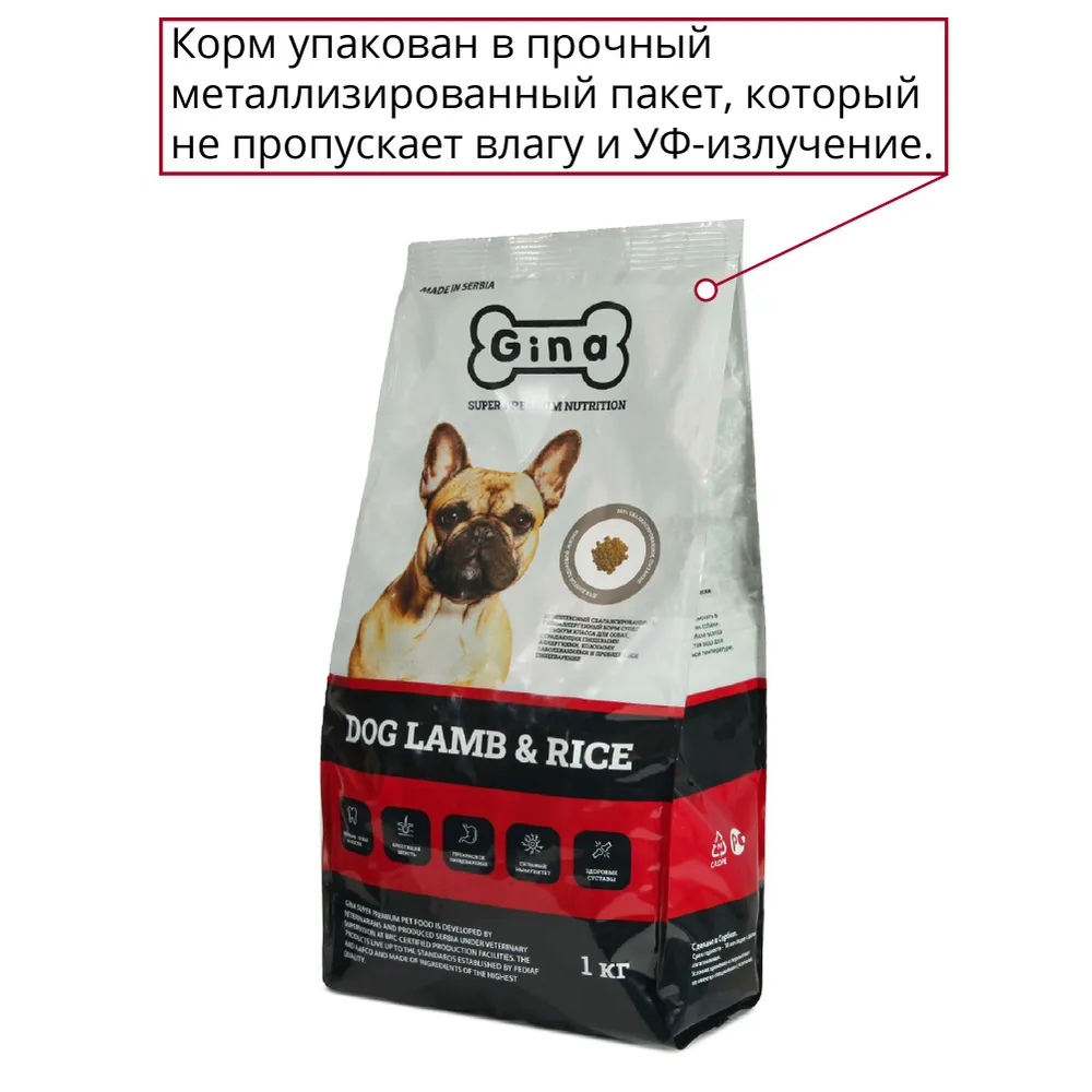 Корм сухой для собак гипоаллергенный Gina с ягненком и рисом, 1 кг