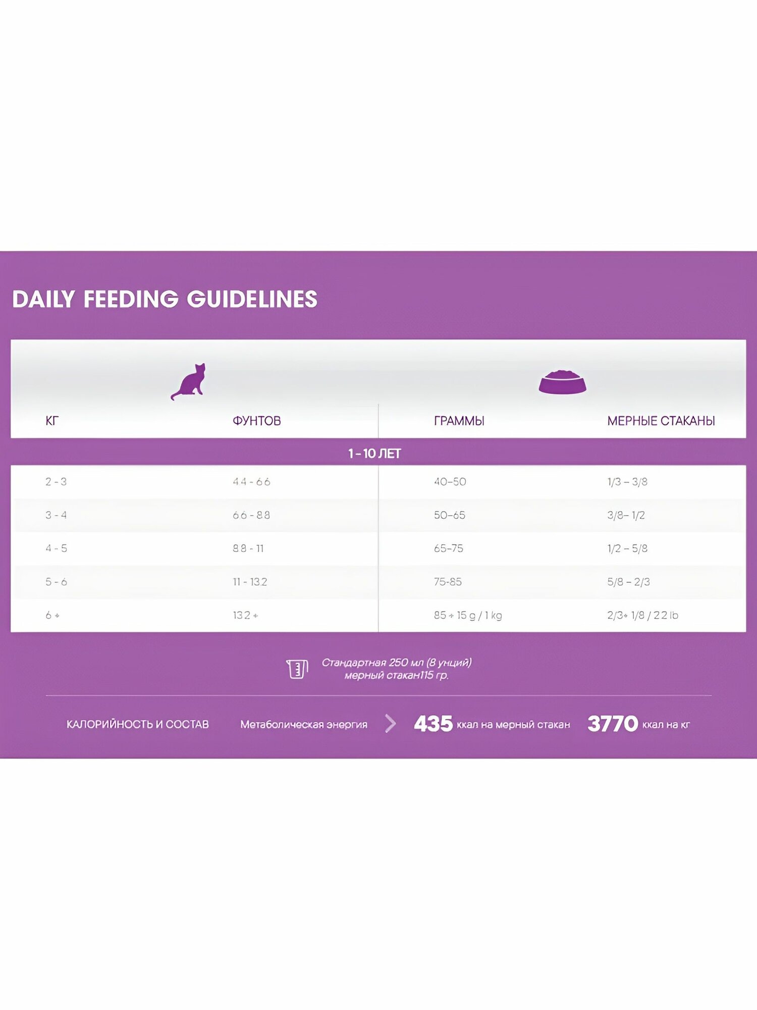 | Дозировка | - вес кошки 2-3 кг - 40-50 г - вес кошки 3-4 кг - 50-65 г - вес кошки 4-5 кг - 65-75 г - вес кошки 5-6 кг - 75-85 г - вес кошки 6+ кг - 85 + 15 г/кг |