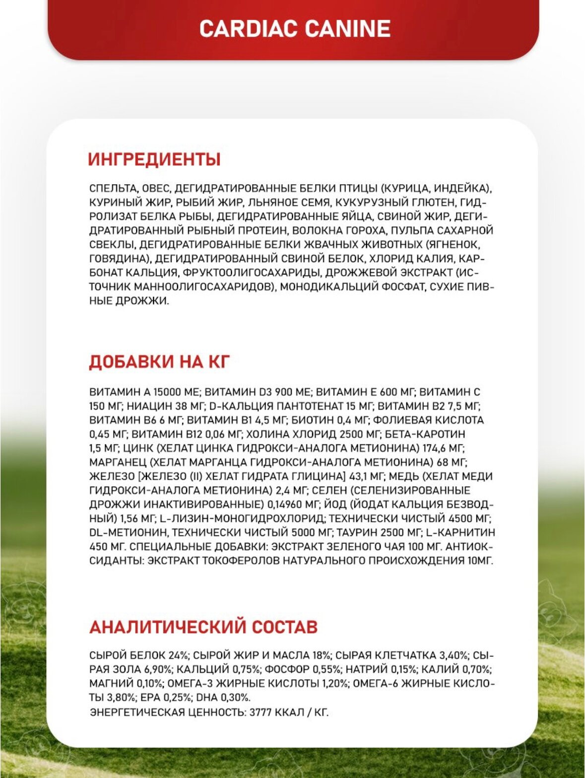 | Состав | спельта, овес, дегидратированное куриное мясо, животные жиры, рыбий жир, льняное семя, кукурузный глютен, гидролизат животного белка, дегидратированные цельные яйца, дегидратированная рыба, волокна гороха, пульпа сахарной свеклы, хлорид калия, карбонат кальция, фруктоолигосахариды (ФОС), олигосахариды маннозы на основе экстракта Saccharomyces cerevisiae, дрожжи сушеные пивные, экстракт зеленого чая (источник полифенолов), экстракт календулы (источник лютеина) |