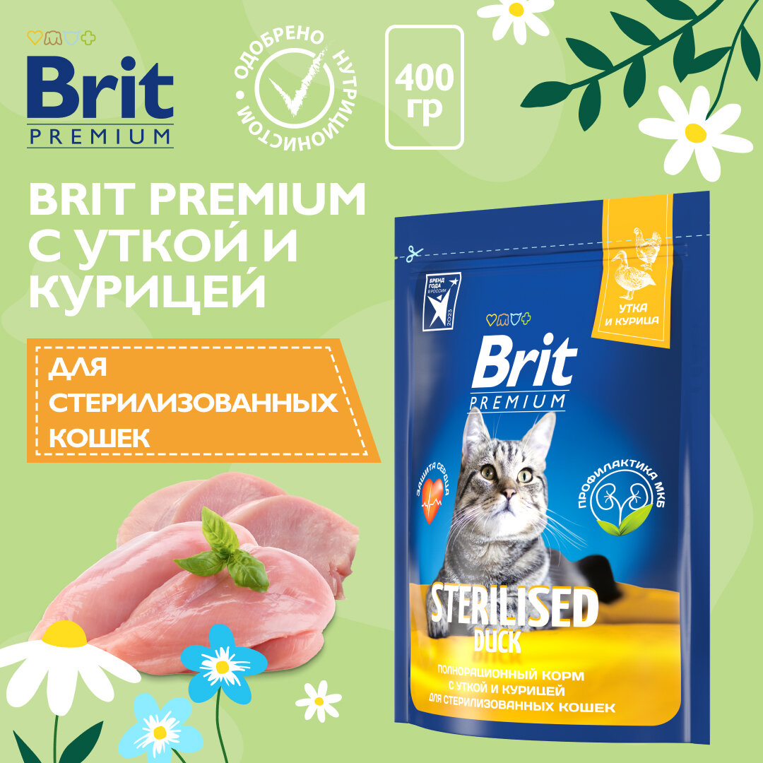 Brit Сухой корм премиум класса с уткой и курицей для взрослых стерилизованных кошек 400г 0.4 кг