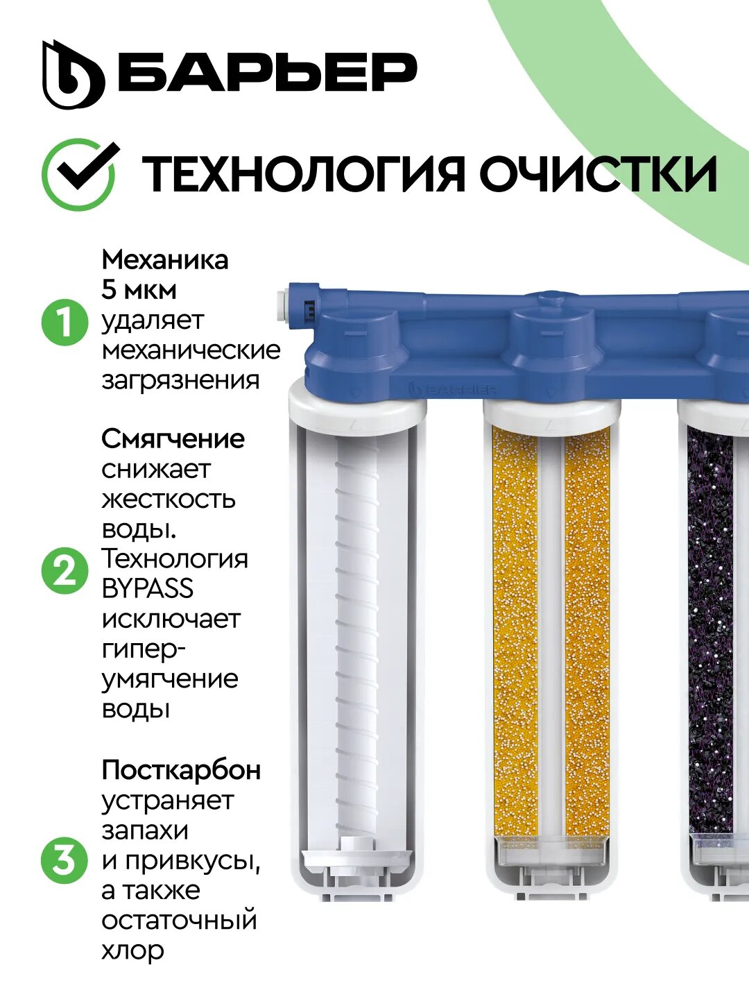 Фильтр под мойку для очистки воды трехступенчатый, быстросъемный барьер эксперт слим Жесткость (без крана), защищает от накипи, смягчение воды, очистка от хлора и его соединений,100% защита от протечки