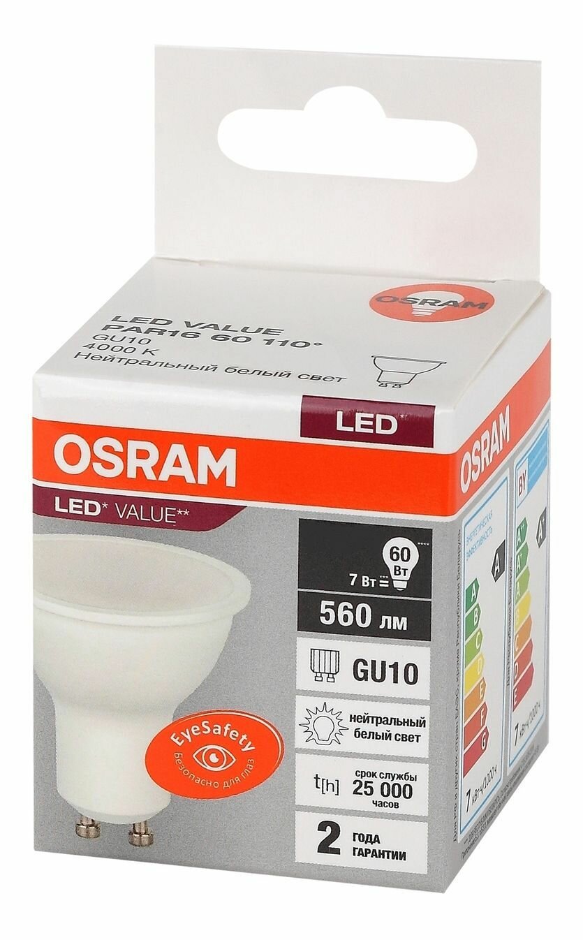 Купить 5шт/уп. Лампа LED Софит 7Вт 220-240В GU10 PAR16 560Лм 4000К Угол 110 град. d 50mm h 54mm Свет Дневной белый Osram, уп. 5шт