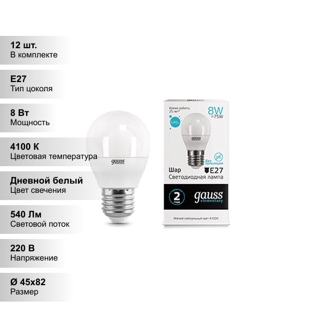 (12 шт.) Светодиодная лампочка Gauss G45 шар, мощность 6 Вт, напряжение питания 180-240 В, цветовая температура 3000 К, теплый белый свет, цоколь E27, размер 45х78 мм, 53216