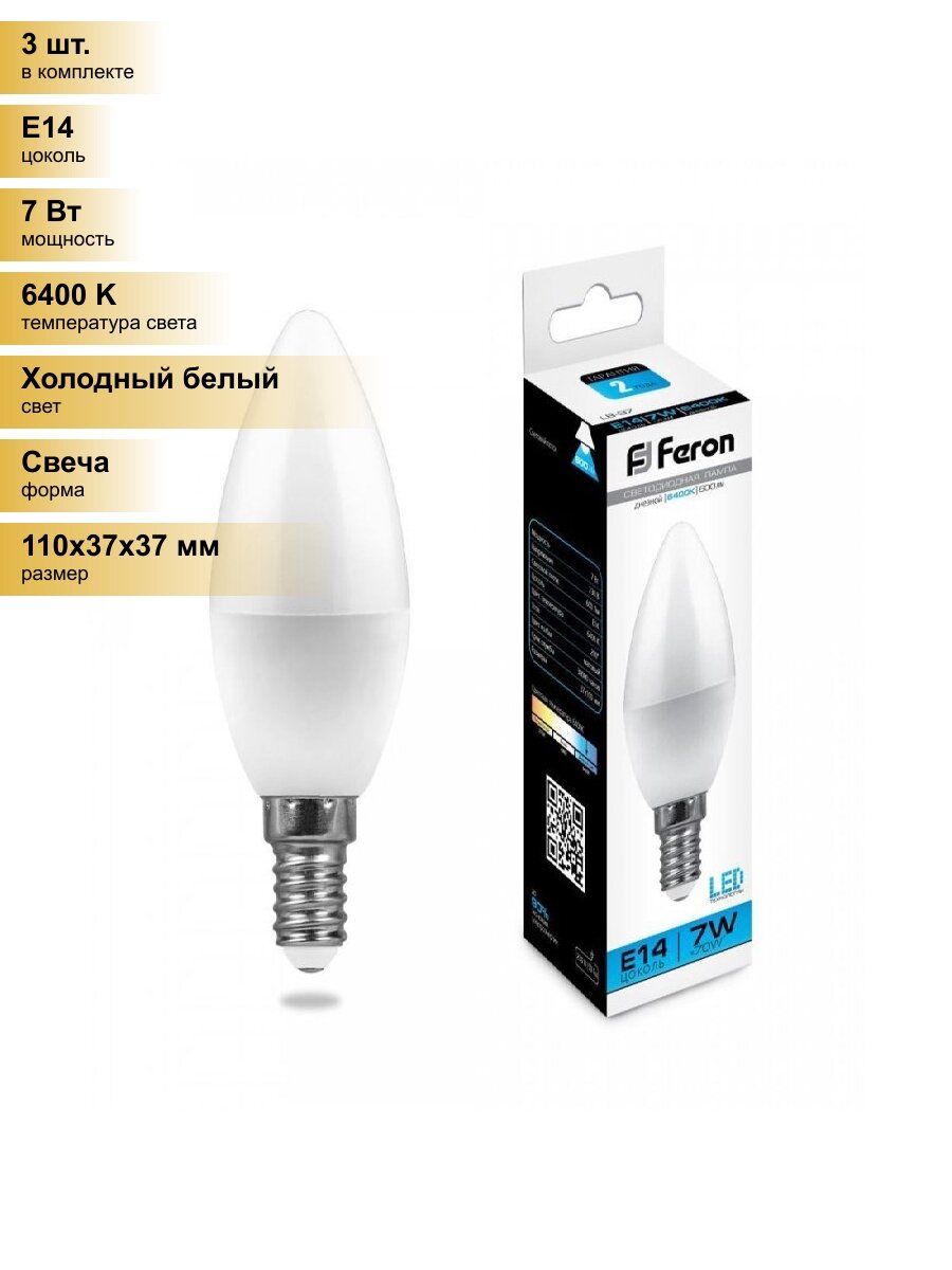 Купить (3 шт.) Светодиодная лампочка Feron свеча C37 E14 7W(600lm) 6400K 6K матовая 100x37, LB-97 25477 Холодный белый. Цоколь E14