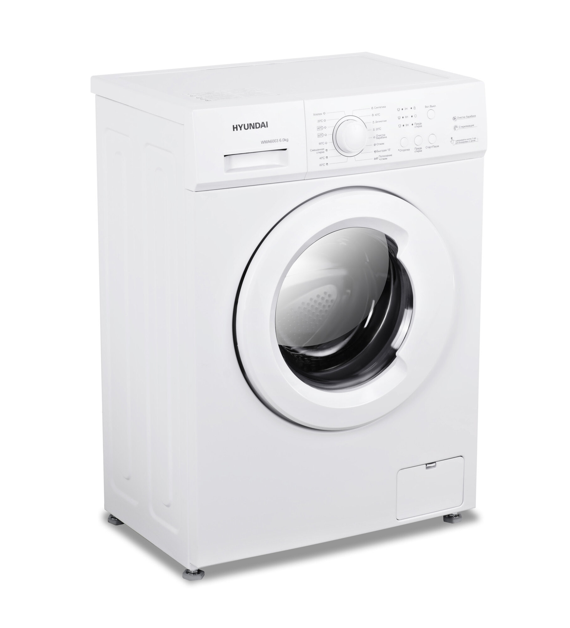 Купить Стиральная машина Hyundai WMA6003, глубина 45 см, загрузка 6 кг, электронно-механическое управление, 1000 оборотов, 8 программ, быстрая стирка 15 мин, отсрочка старта, белый