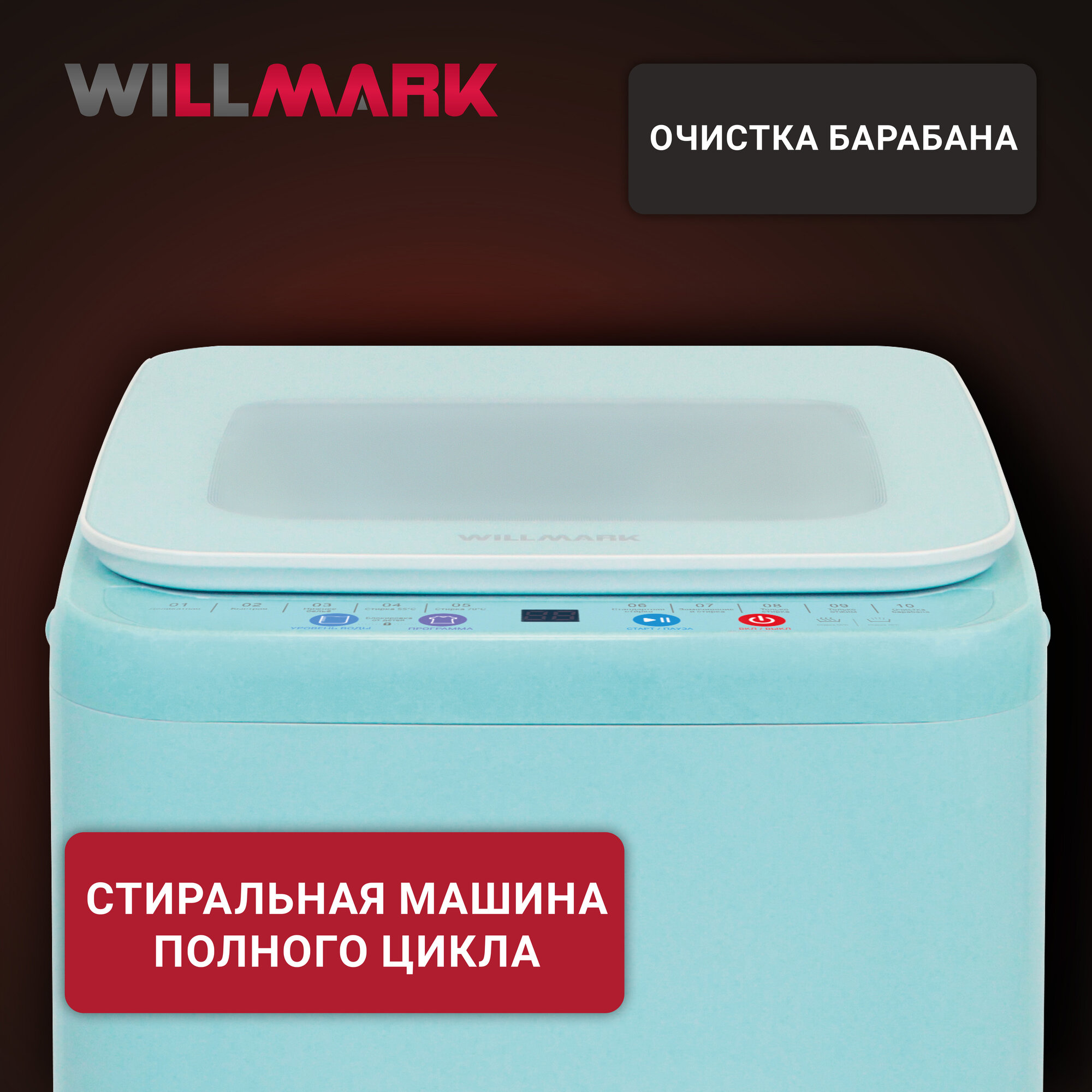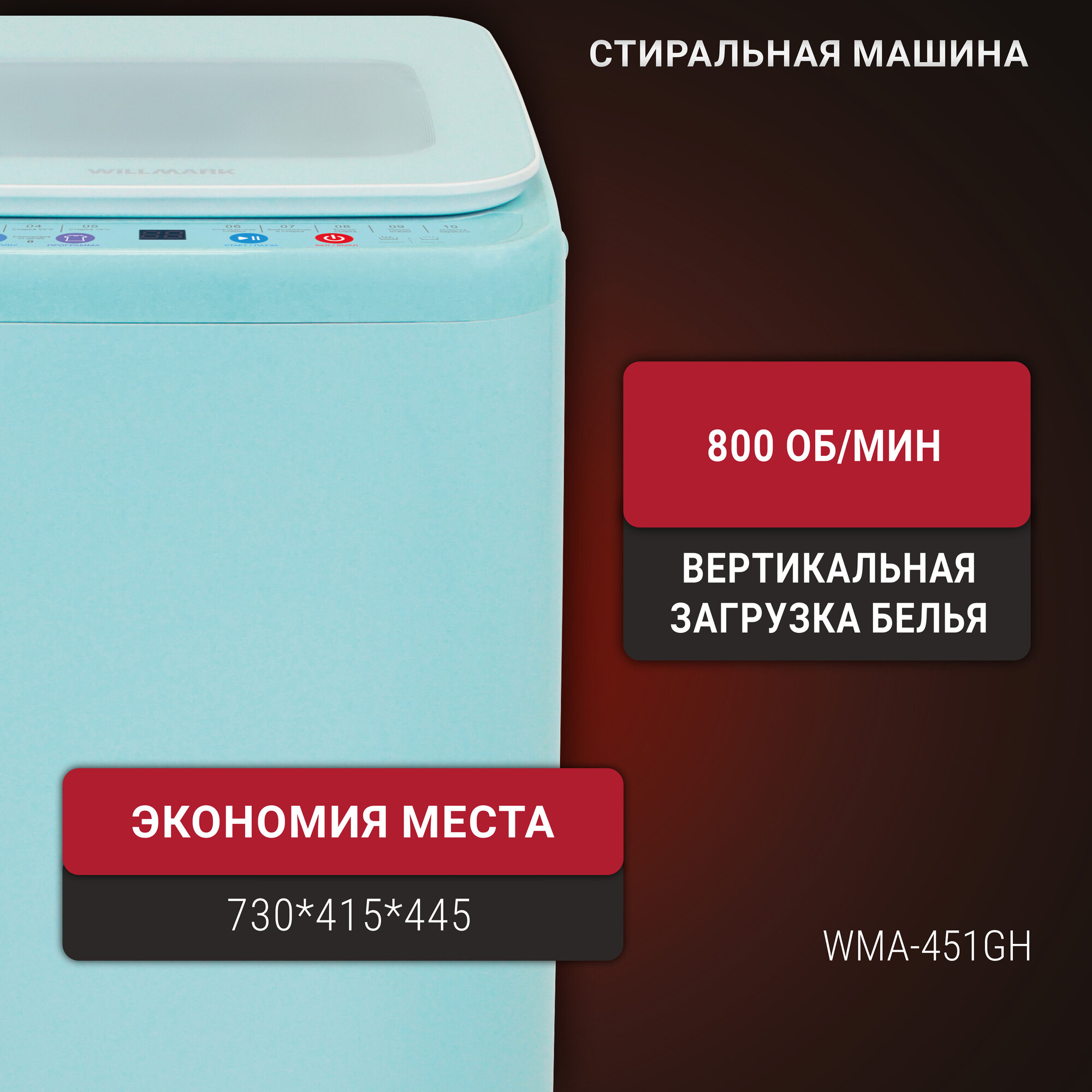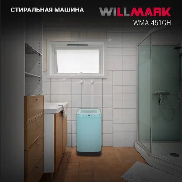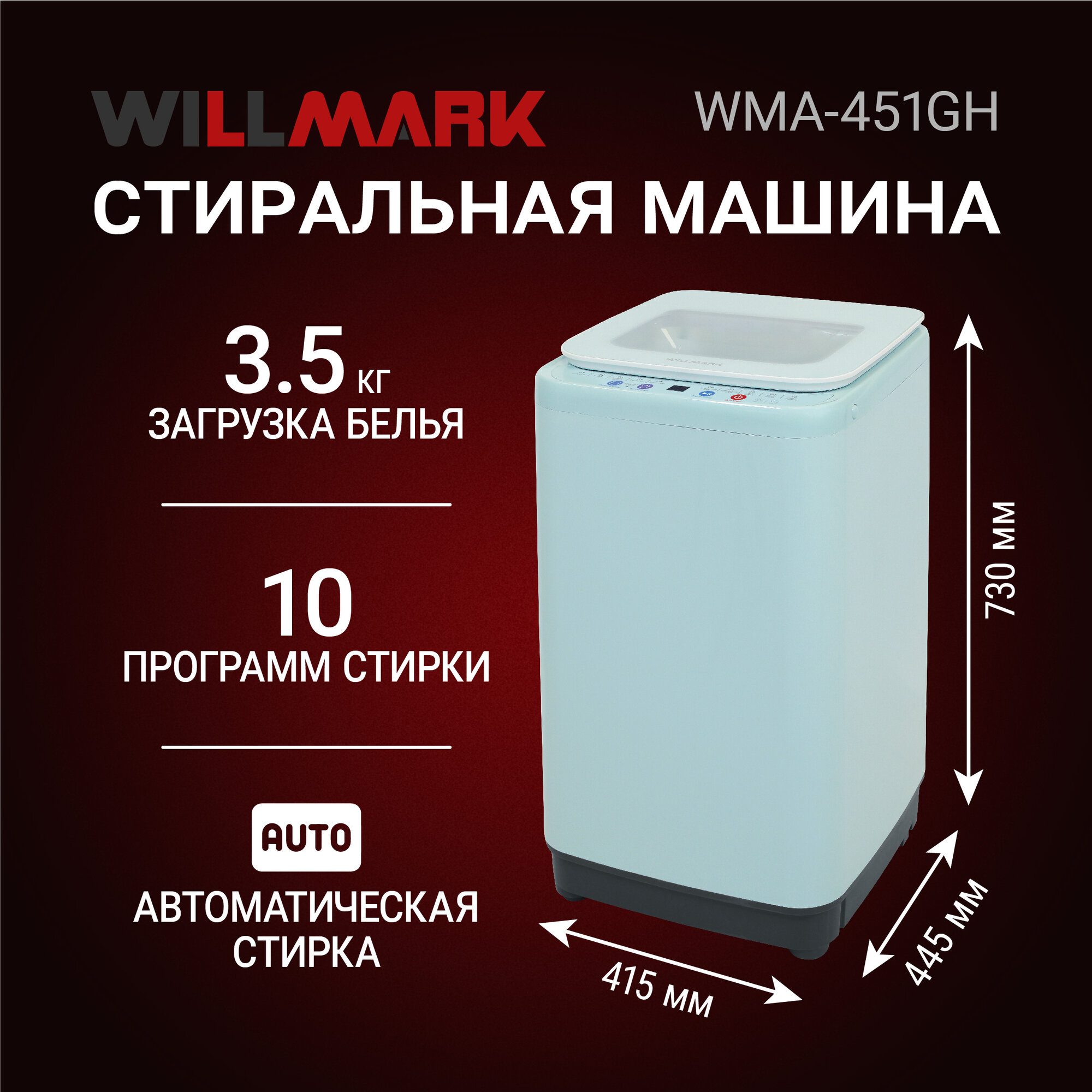 Купить Стиральная машина WILLMARK WMA-451GH (автомат,3,5кг,10прог, нагр. воды, верт. загр, стекл. крыш, бирюз.)
