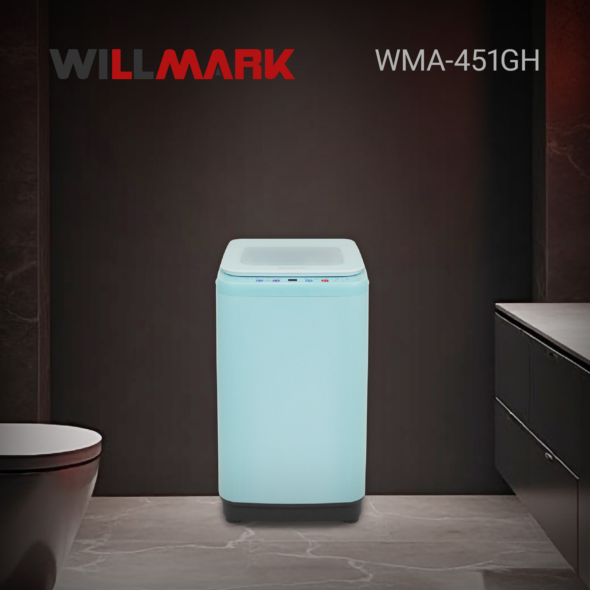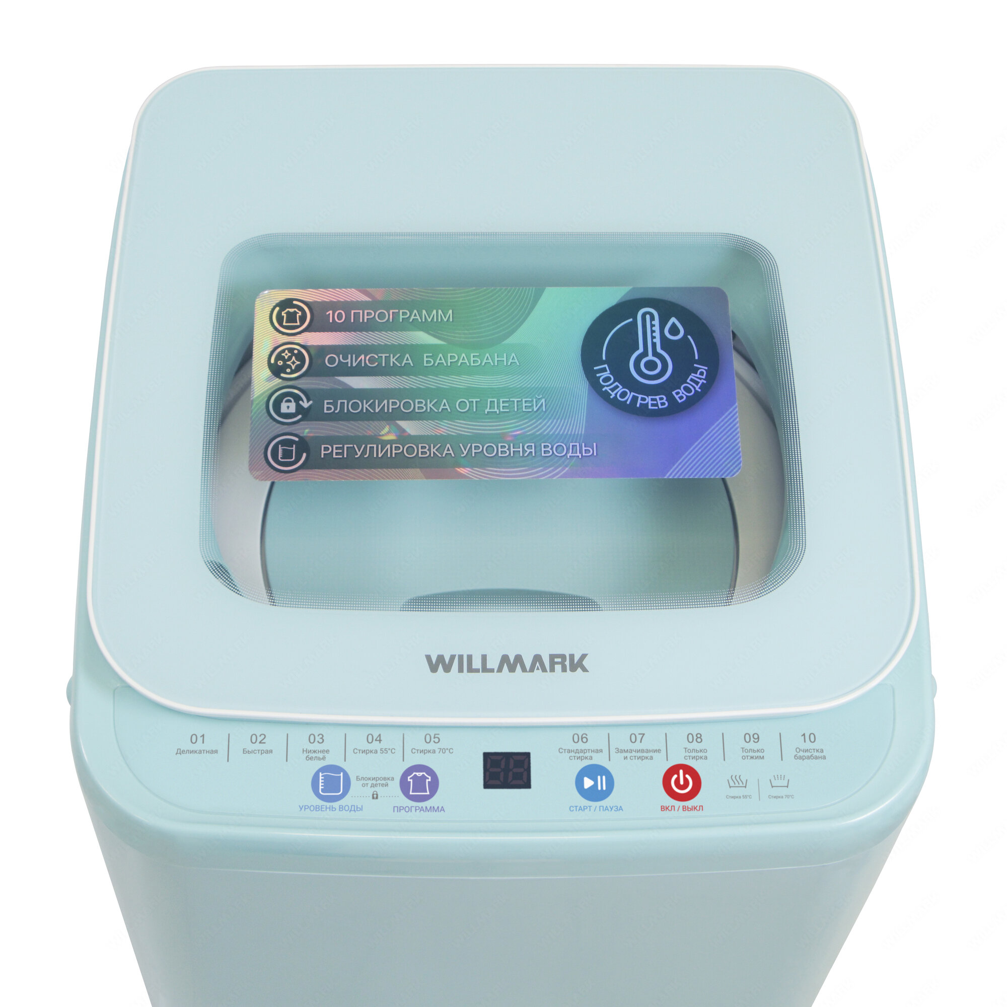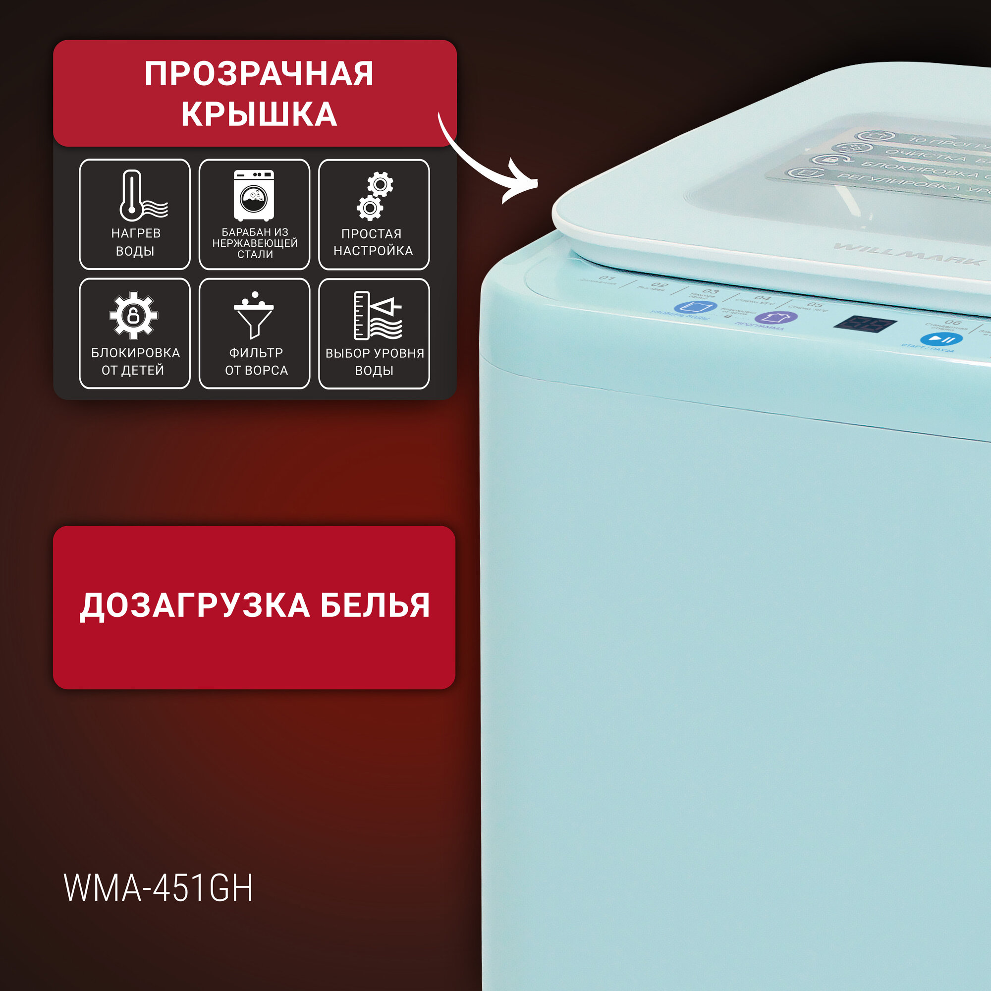 Купить Стиральная машина WILLMARK WMA-451GH (автомат,3,5кг,10прог, нагр. воды, верт. загр, стекл. крыш, бирюз.)