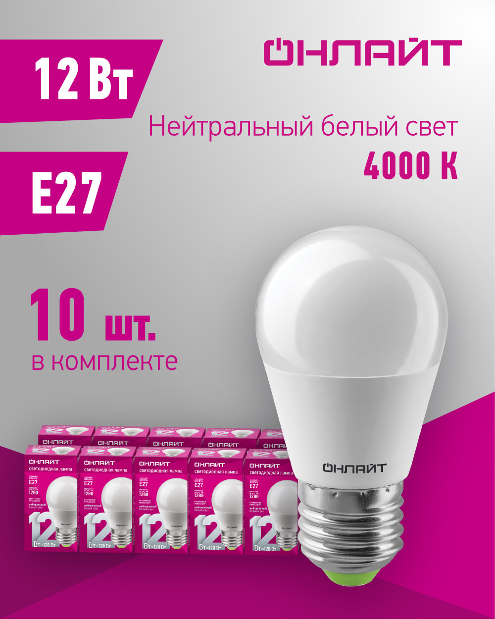 Купить Лампа светодиодная онлайт 90 064, 12 Вт, шар Е27, дневной свет 4000К, упаковка 10 шт.