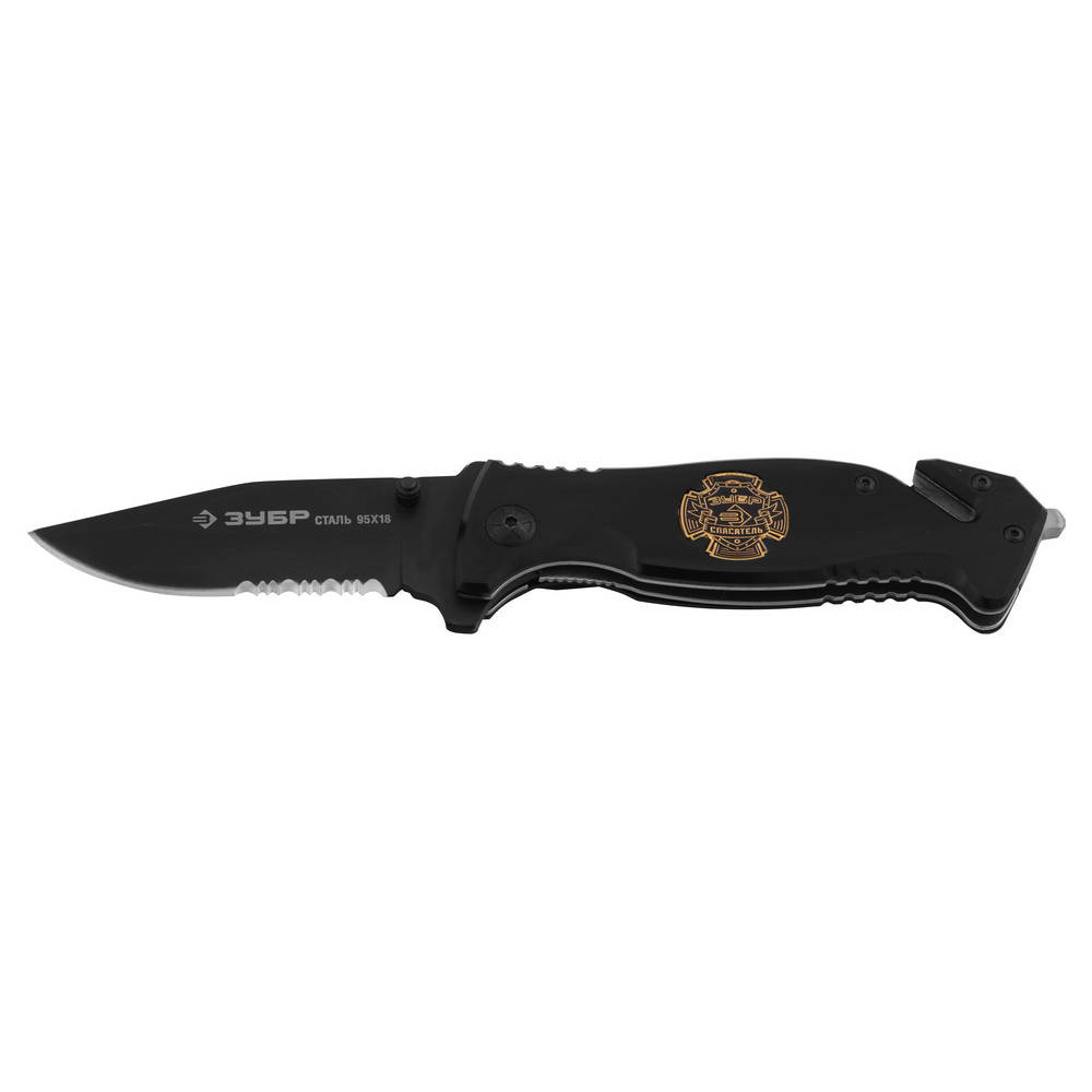 Складной нож ЗУБР Спасатель 200 мм лезвие 90 мм серрейторная заточка наконечник для стекол (47707_z01)
