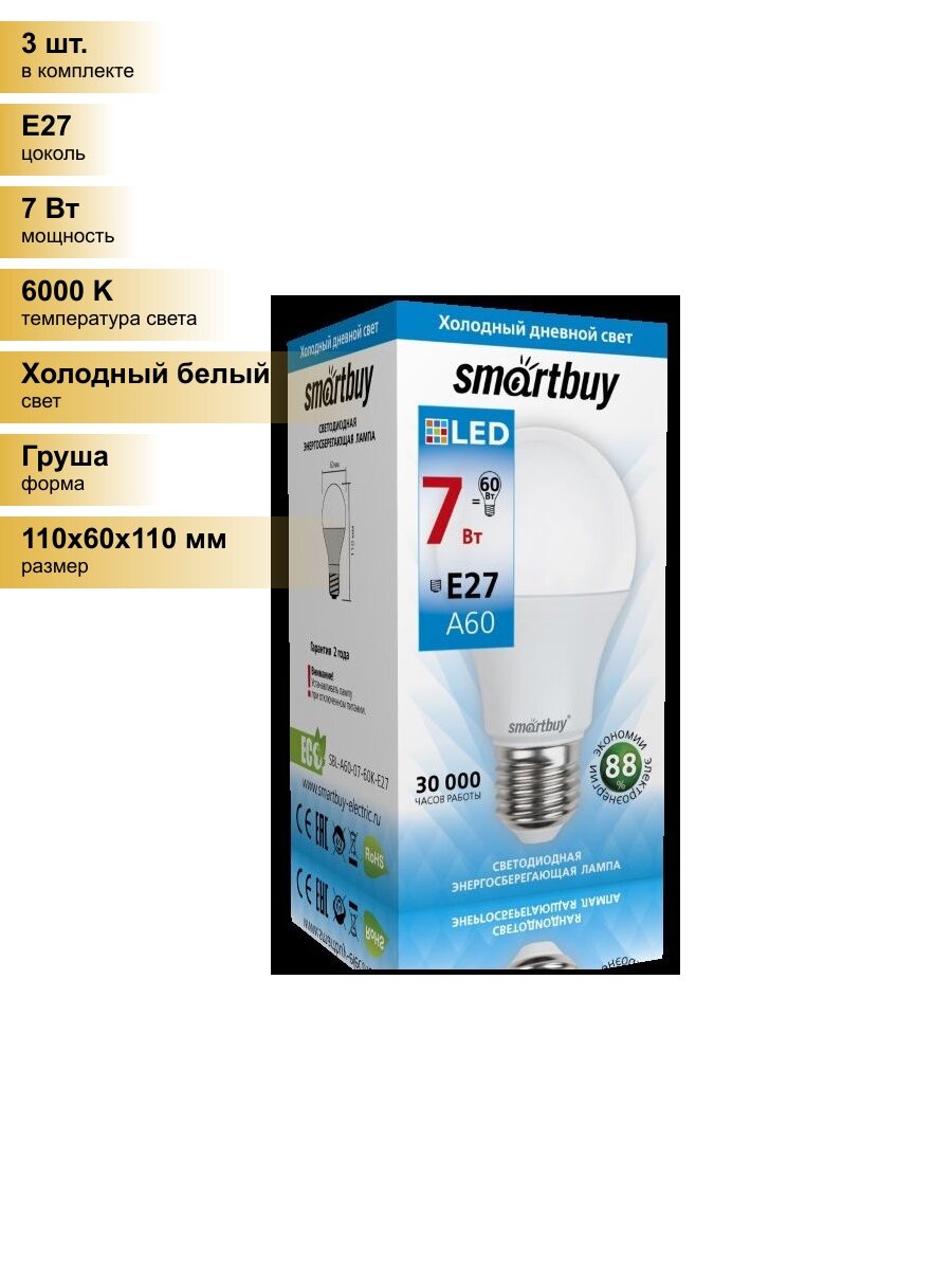 Купить (3 шт.) Светодиодная лампочка SmartBuy ЛОН A60 E27 7W(650lm) 6000K 6K 110x60 SBL-A60-07-60K-E27 Холодный белый. Цоколь E27