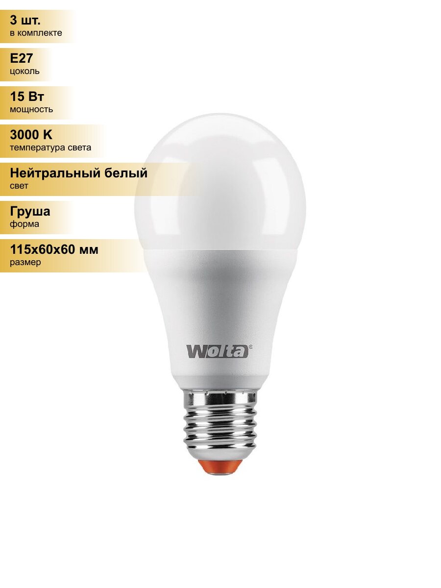 Купить (3 шт.) Светодиодная лампочка Wolta лампа св/д ЛОН A60 E27 15W(1500lm) 3000K 2K 2K 115x60 25Y60BL15E27 Нейтральный белый. Цоколь E27