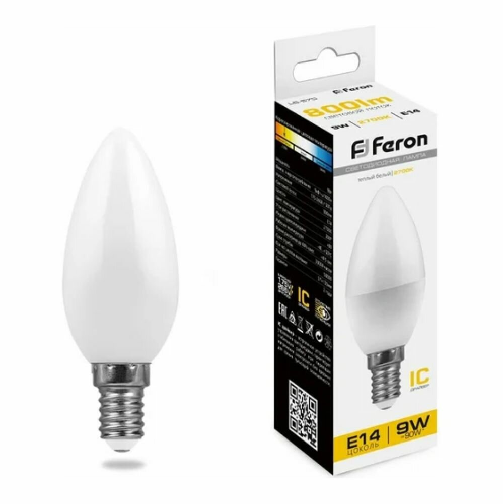 1шт/уп. Лампа LED Свеча 9Вт 230B C37 E14 800Лм 2700К Свет Теплый белый арт. 25798 Feron, уп. 1шт