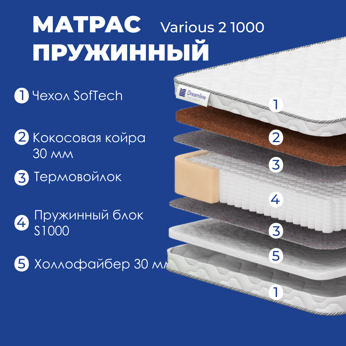 Купить Матрас Dreamline Various 2 1000 180х200х21 см, жесткий, пружинный, разносторонний