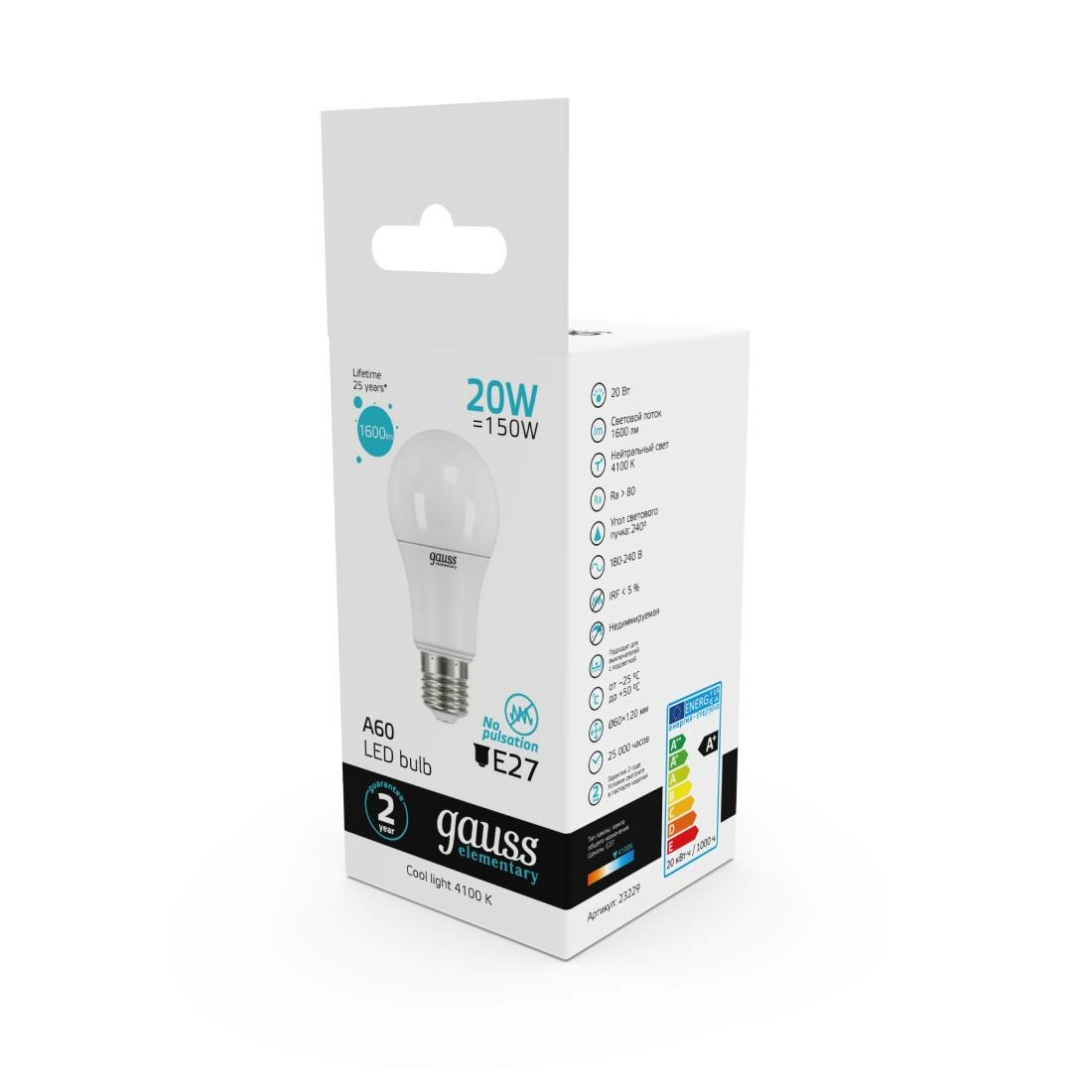 (20 шт.) Светодиодная лампочка Gauss А60, груша, мощность 20 Вт, напряжение питания 180-240 Вт, цветовая температура 4100 K, нейтральный белый свет, цоколь E27, размер 60х124 мм