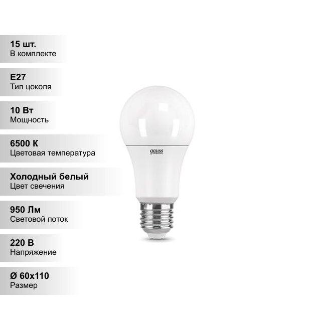 Купить (15 шт.) Светодиодная лампочка Gauss Elementary А60 10Вт 150-265Вт 6500K E27