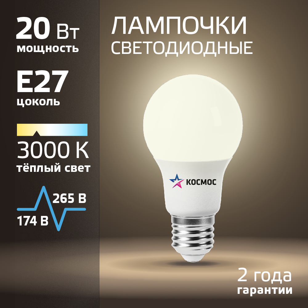 Лампа светодиодная КОСМОС 3000K, E27, A60, 20 Вт, 3000 К