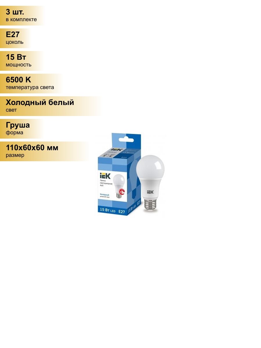 (3 шт.) Светодиодная лампочка IEK ЛОН A60 E27 15W(1350lm) 6500К 6K 110х60 ECO LLE-A60-15-230-65-E27 . Цоколь E27