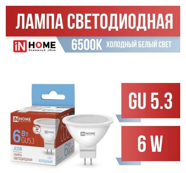 (6 шт.) Светодиодная лампочка IN HOME JCDR, мощность 6 Вт, напряжение питания 220 В, цветовая температура 3000К, теплый белый свет, цоколь GU5.3, размер 50х51 мм