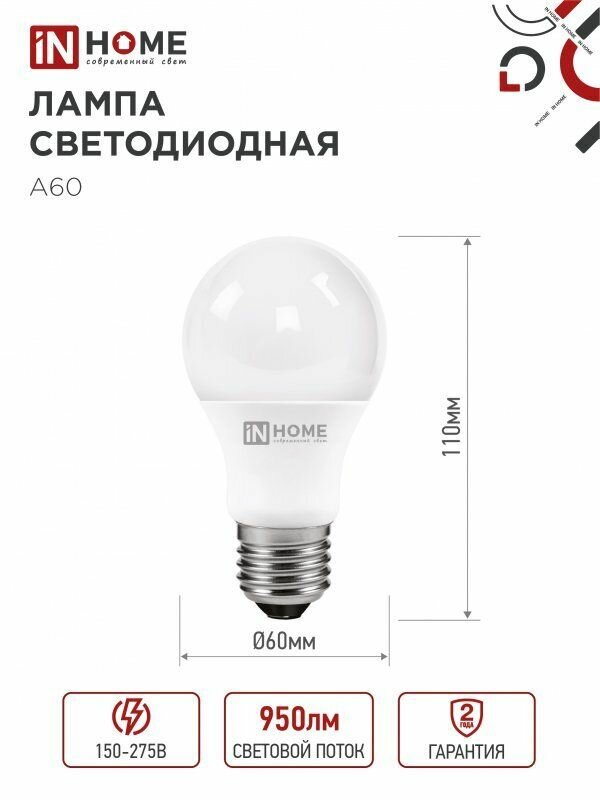 Лампа светодиодная IN HOME LED-A60-VC (4690612020303), E27, A60, 20 Вт, 4000 К