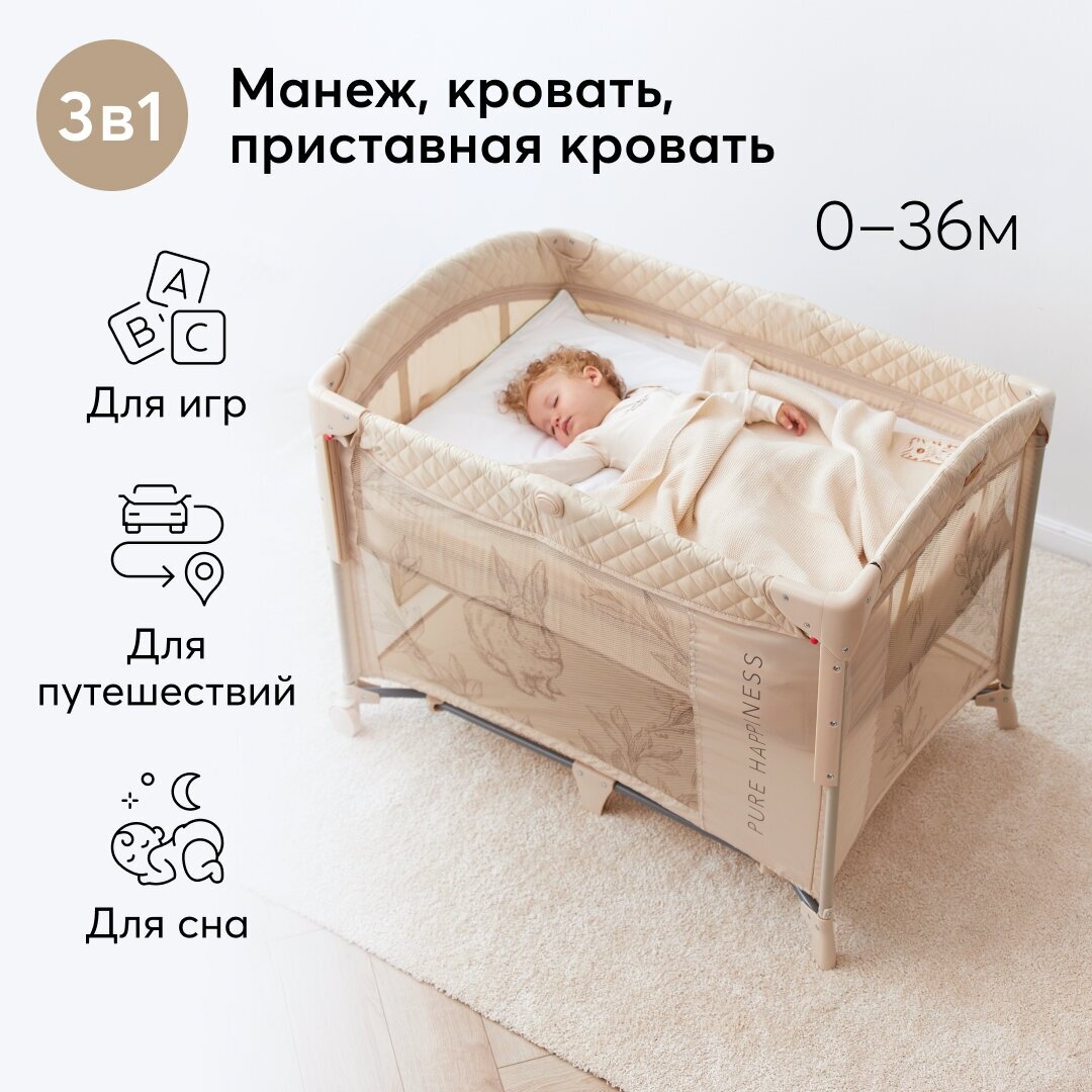 Манеж детский складной Happy Baby WILSON, манеж кровать для новорожденных с колёсами, регулировка высоты, сумка-чехол в комплекте, бежевый