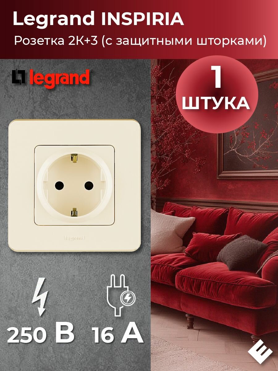 СохранитьРозетка Слоновая кость, с заземлением со шторками немецкий стандарт 16А, Legrand INSPIRIA интересное: