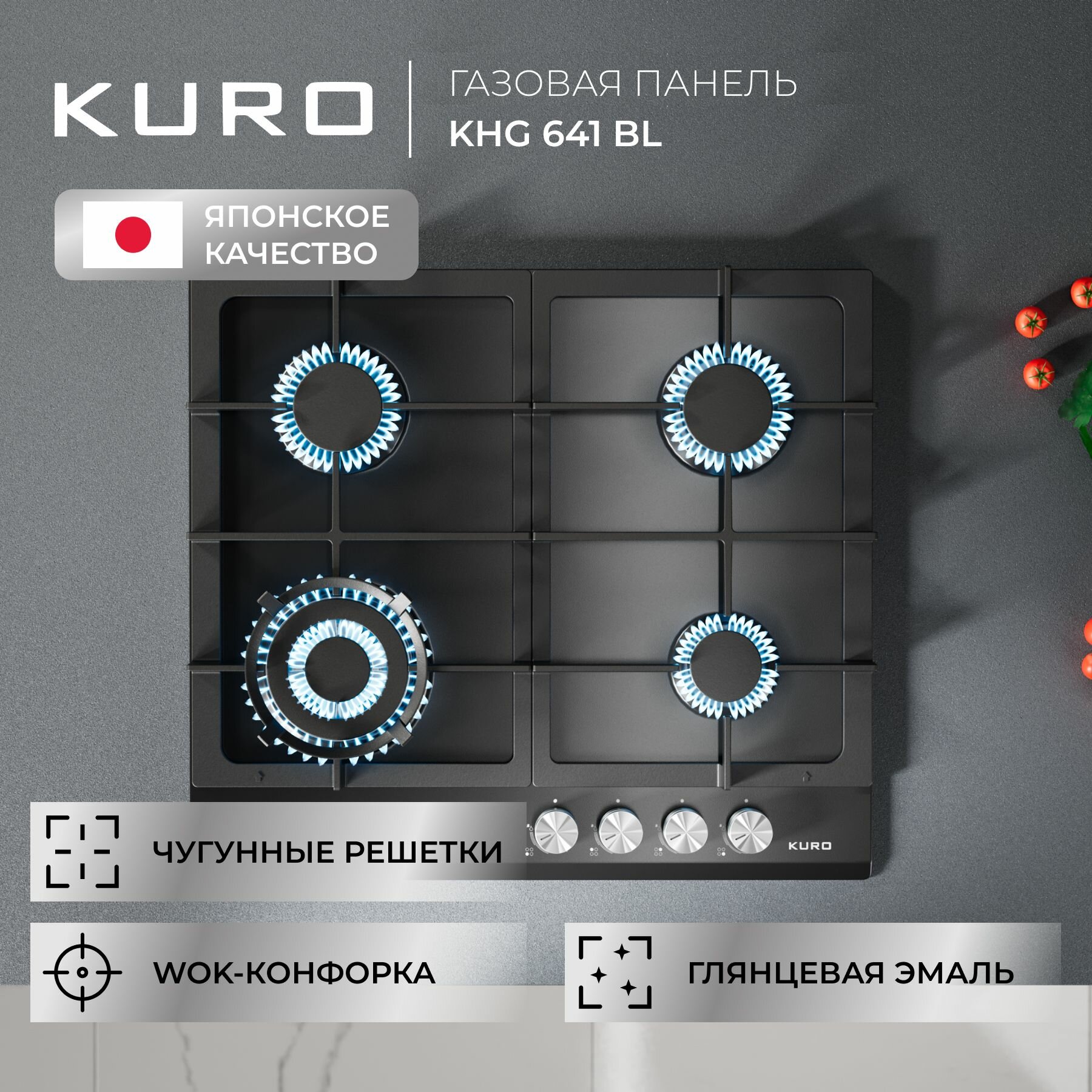 Купить Газовая встраиваемая варочная панель 60 см KURO KHG 641 BL, газ-контроль, электроподжиг, WOK-конфорка, чугунные решетки, черный
