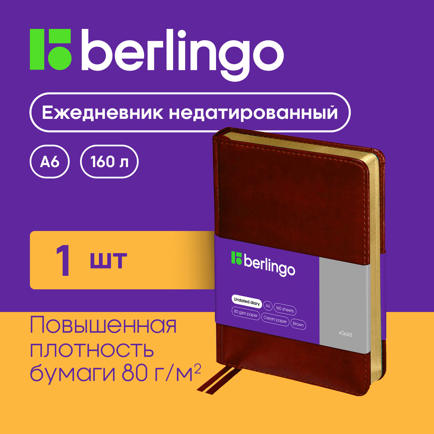 Ежедневник недатированный Berlingo A6, 160 листов, кожзам, "xGold", золотой срез, коричневый (UD0_81603)