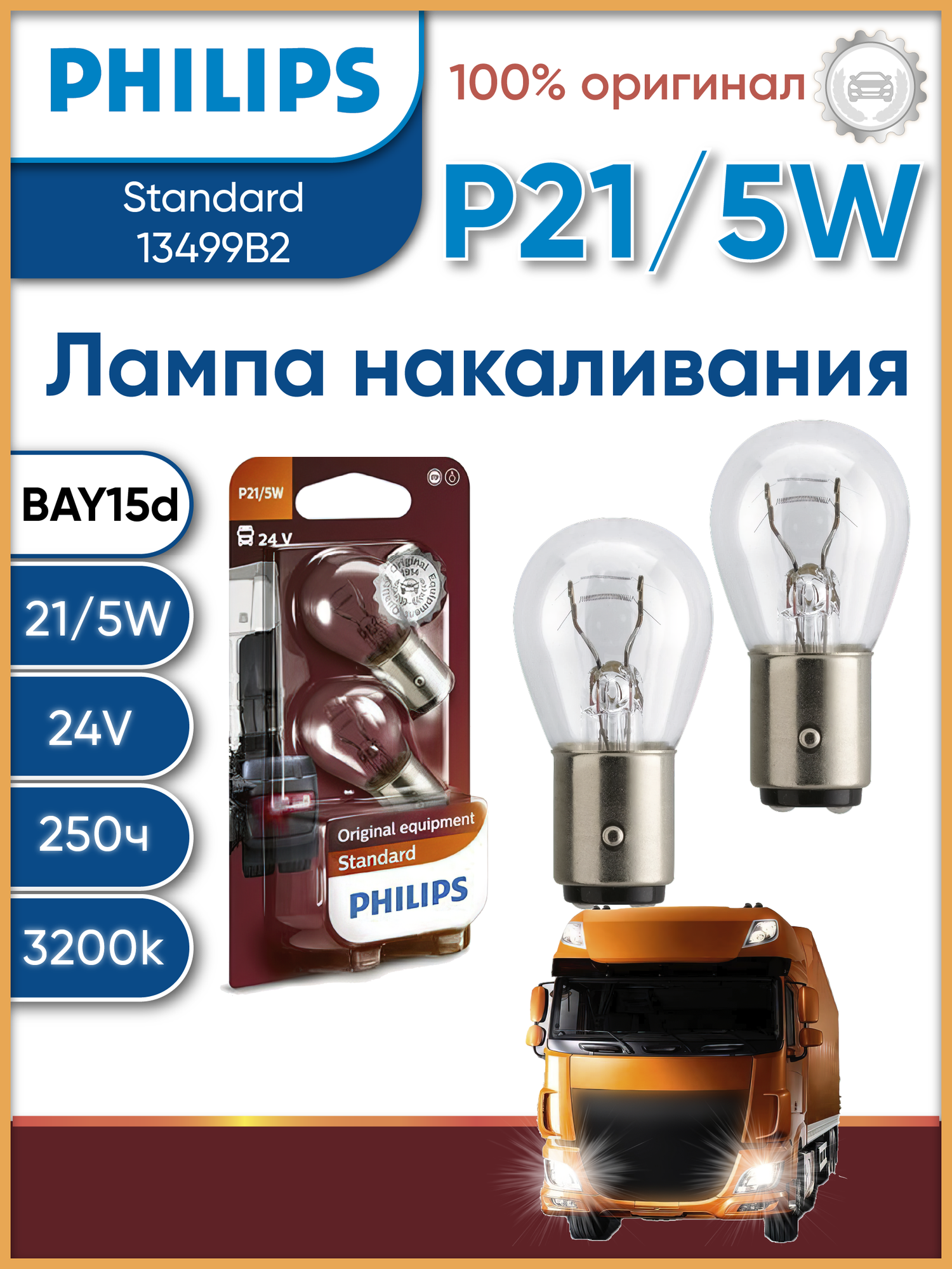 PHILIPS 13499B2 Автолампа P21/5W 24V-21/5W (BАY15d) (блистер 2шт.)