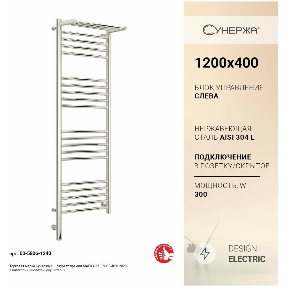 Полотенцесушитель электрический Сунержа Богема 3.0, 1200x400, МЭМ левый, с полкой, сталь полированная 00-5806-1240