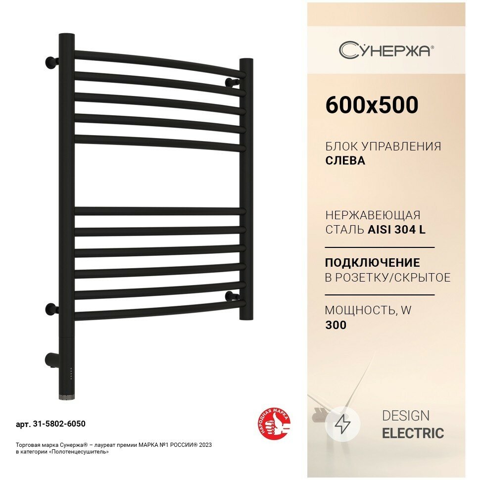 Полотенцесушитель электрический Сунержа Богема 3.0 выгнутая, 600x500, МЭМ левый, матовый чёрный 31-5802-6050